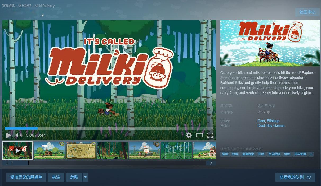 手绘乡村送奶工模拟游戏《Milki Delivery》Steam商店页面上线,发售日期待定,暂无官方中文。跨上自行车,带上你的奶瓶出发吧。在这场短小而温馨的运送冒险中探索乡间、结识新朋友,并通过一瓶瓶牛奶,温和地帮助他们重建社区。升级你的自行车和奶厂,并深入探索这片曾生机勃勃的区域。