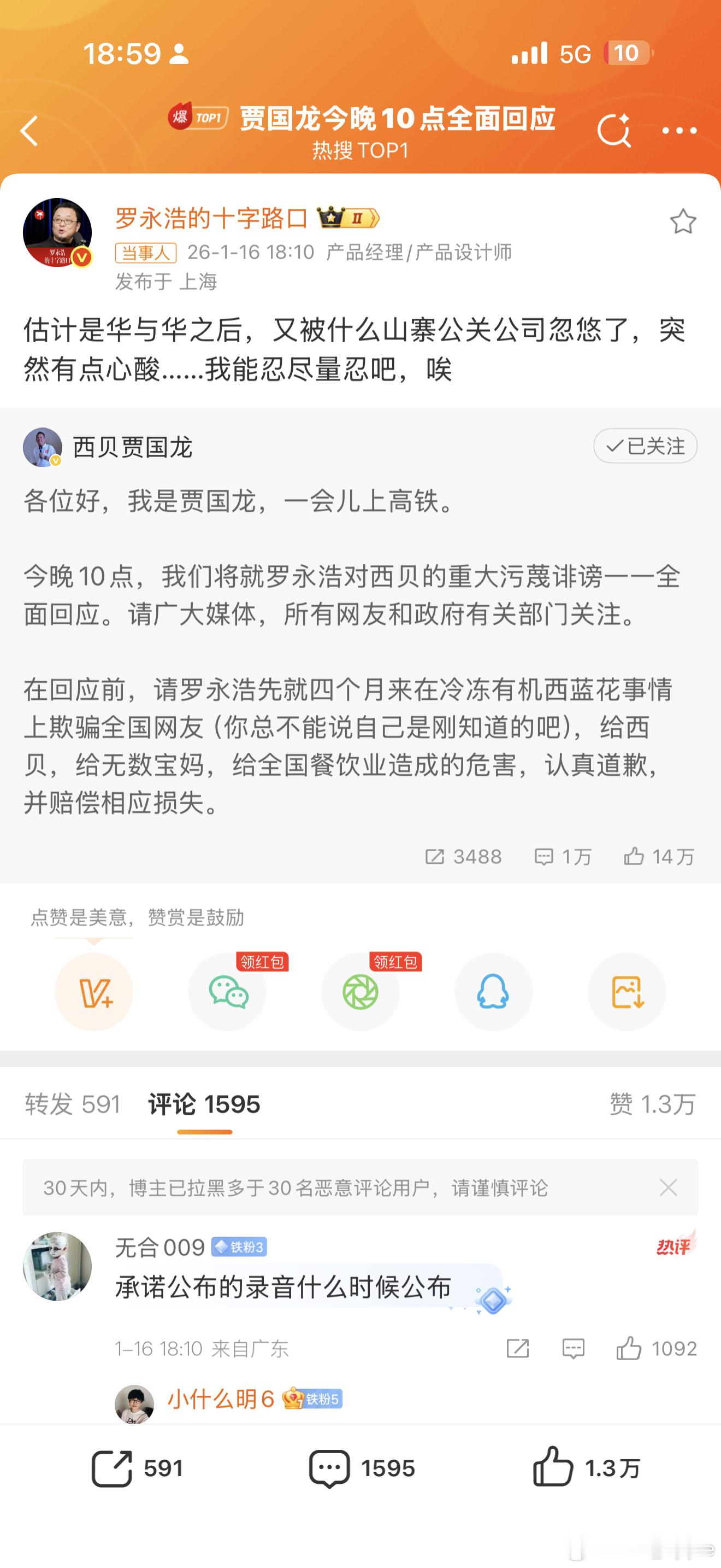 贾国龙今晚10点全面回应 以为这事都过去了,没想到今天晚上10点又有新进展 老罗罗永浩也迅速回应 今晚10点蹲一波看看🤔
