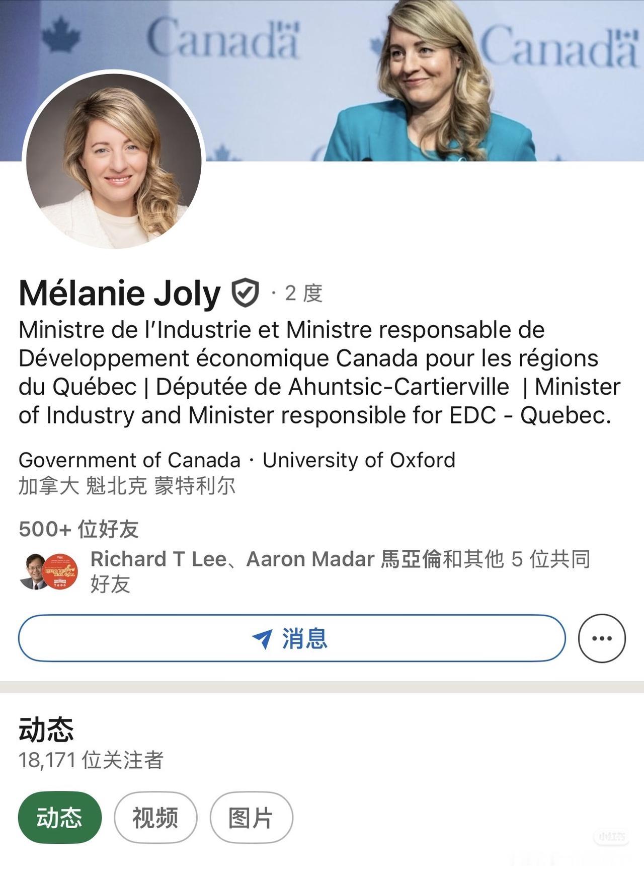 卡尼身边的“金发飒姐”,才是中加谈判的“关键先生”! 加拿大总理卡尼访华,身旁那位一头金发、打扮干练的女士,成功吸引了不少目光,她可不是普通的随行人员,而是加拿大的工业部长——梅拉妮·乔利。她有个响当当的绰号,叫“利姐”。 这位“利姐”来头不小,曾当过外交部长,是牛津大学的高材生,还是执业律师出身,专业能力绝对过硬,这次以工业部长的身份坐在谈判桌旁,信号再明确不过了,中加双方要谈的不是空话,而是汽车、科技、贸易这些实打实的产业合作。 她思维敏捷,作风利落,是典型的实力派,有她在场,往往意味着谈判进入了讨论具体条款的深水区,可以说,她是加方团队里,能把合作蓝图变成可落地协议的关键人物。 所以说,看国际新闻不能光看主角。有时候,坐在主角身边那位沉着冷静的“王牌”,才是真正推动故事发展的人。 这位“利姐”的出现,让这次访问的务实色彩格外浓厚。 对此你怎么看?你是否也注意到,如今在国际舞台上,这样干练、专业的女性领导者越来越多了?她们给你留下了什么印象?欢迎在评论区聊聊你的观察!