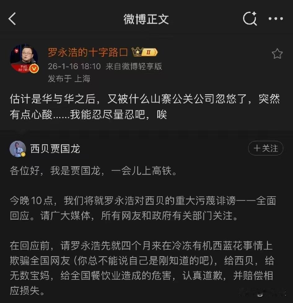 断人财路好比杀人父母。西贝销量断崖式下跌,西贝老板贾国龙把西贝销量断崖式下跌的原因,归结于有人抹黑西贝,故意造谣西贝是预制菜,所以贾国龙对于抹黑西贝的行为极其愤怒,所以做出澄清。罗永浩与贾国龙的仇恨梁子算是结下了,这辈子可能都无法解开。这两个人的良知最终是否会对簿公堂呢?毕竟我国是不允许私斗的。如果真的败坏了西贝的名誉,贾国龙完全可以提起民事侵权诉讼,就不知道他是否会这么做。