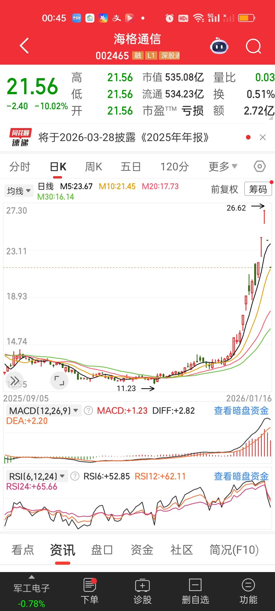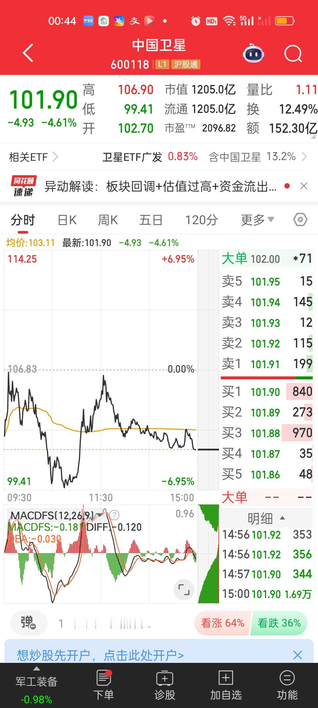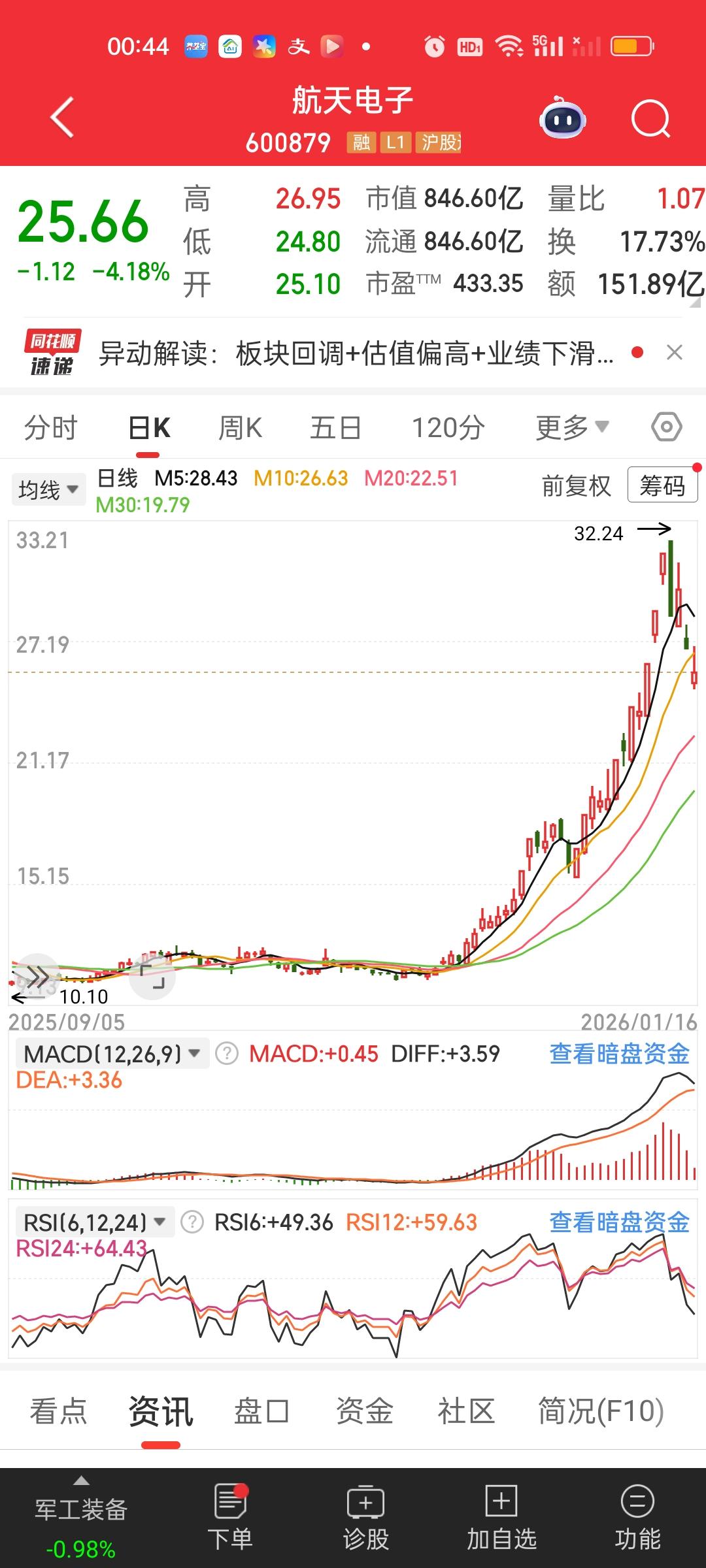 商业航天里面的核心个股目前来看还没到位,通常认为第一轮调整幅度起码在30%左右。中国卫通前高53.88,今天最低点38.16,收盘40.16,38.16/53.88=0.7082, 40.16/53.88=0.7453,最低点距离前高下跌了29.18%,收盘价距离前高下跌了25.47%。 中国卫星前高127.77,今天最低点99.41,今天收盘价101.90,99.41/127.77=0.7780,101.90/127.77=0.7975,今天最低点距离前高下跌了22.20%,收盘价距离前高跌了20.25%。 航天电子前高32.24,今天最低点24.80,收盘价25.66,24.80/32.24=0.7692,25.66/32.24=0.7959,今天最低点距离前高下跌了23.08%,今天收盘距离前高下跌了20.41%。 航天发展前高是40.65,今天最低点是29.22 ,今天收盘价是30.40,29.22/40.65=0.7188,30.40/40.65=0.7478,最低点距离前高下跌了28.12%,收盘价距离前高跌了25.22%。 海格通信今天是跌停的,最低点21.56,前高26.62,21.56/26.62=0.8099,下跌了19.01%。 上海瀚讯前高是60.77,最低点49.19,49.19/60.77=0.8094,跌了19.06%。 总结一下:通常第一轮调整幅度都是最猛的,幅度起码在30%以上,今天最低价中国卫通,航天发展已经十分接近了,其它还需要爆杀一天才能到位。