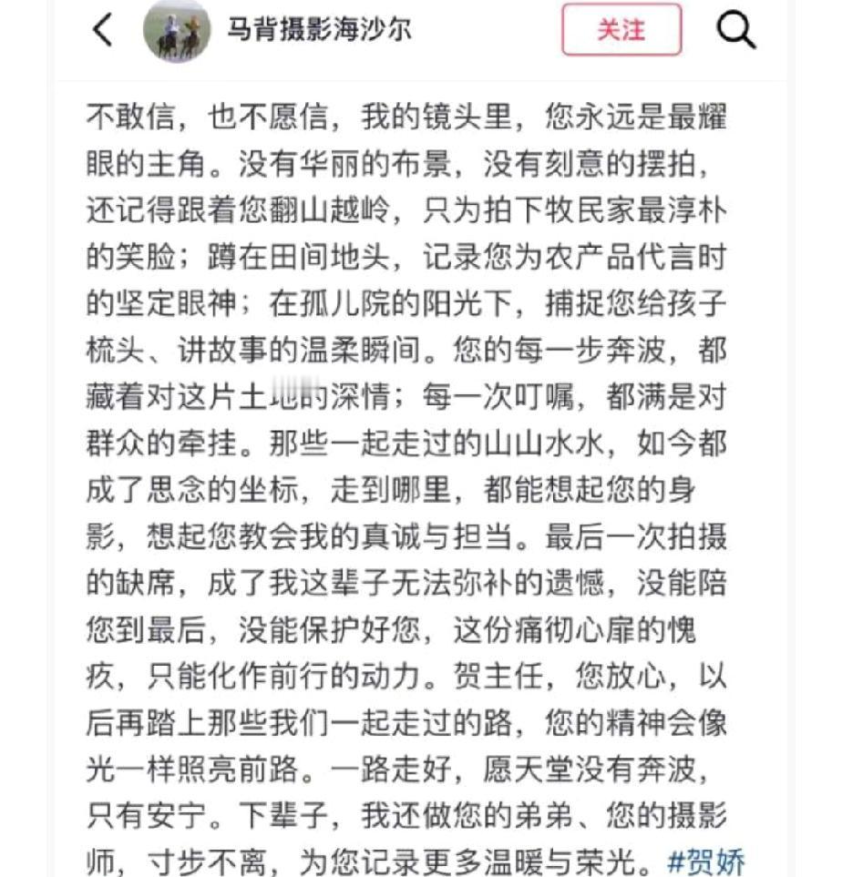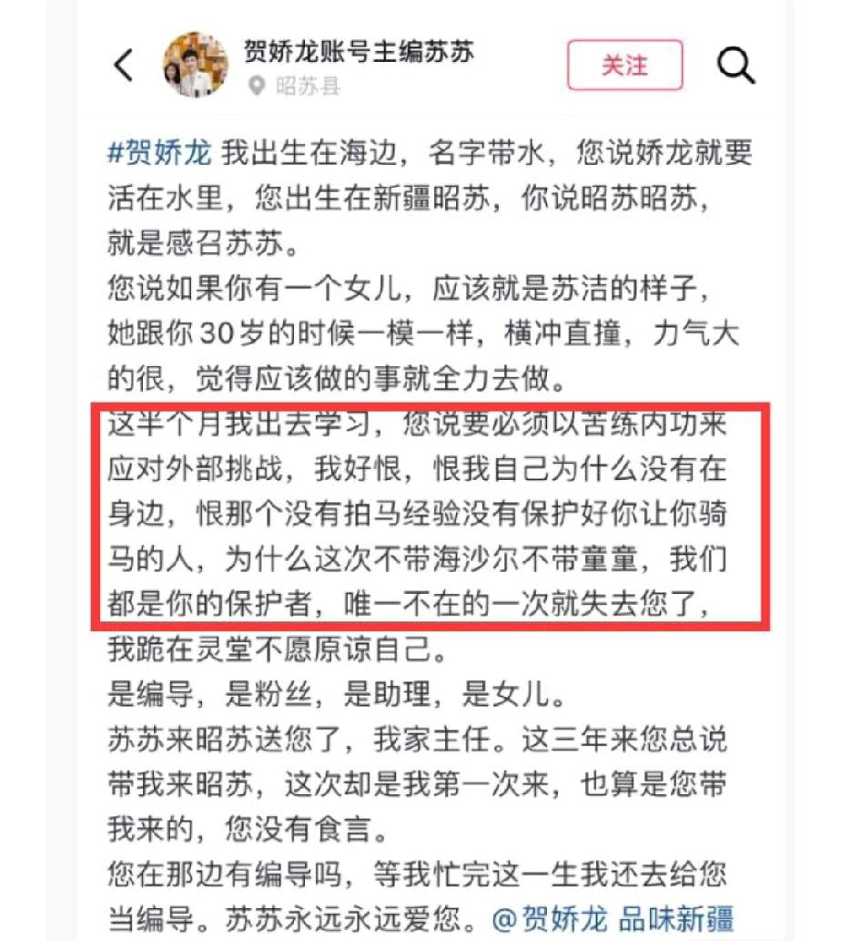 贺娇龙离世原因曝光,苏苏说自己是编导,是粉丝,是助理,是女儿。她认为是摄影师没有拍马经验而导致的意外。 贺娇龙团队的主编苏苏和摄影师海沙尔自责不已,苏苏说她恨自己没有在贺娇龙身边,恨新摄影师没有拍马经验,如果是海沙尔和童童就不会出现意外了。 海沙尔也发文,这唯一的一次缺席拍摄就成了天人永隔,他痛彻心扉,而且很愧疚。 他们都会带着贺娇龙的期盼好好工作,等忙完这一生再与她相聚,继续做她的编导和摄影师。