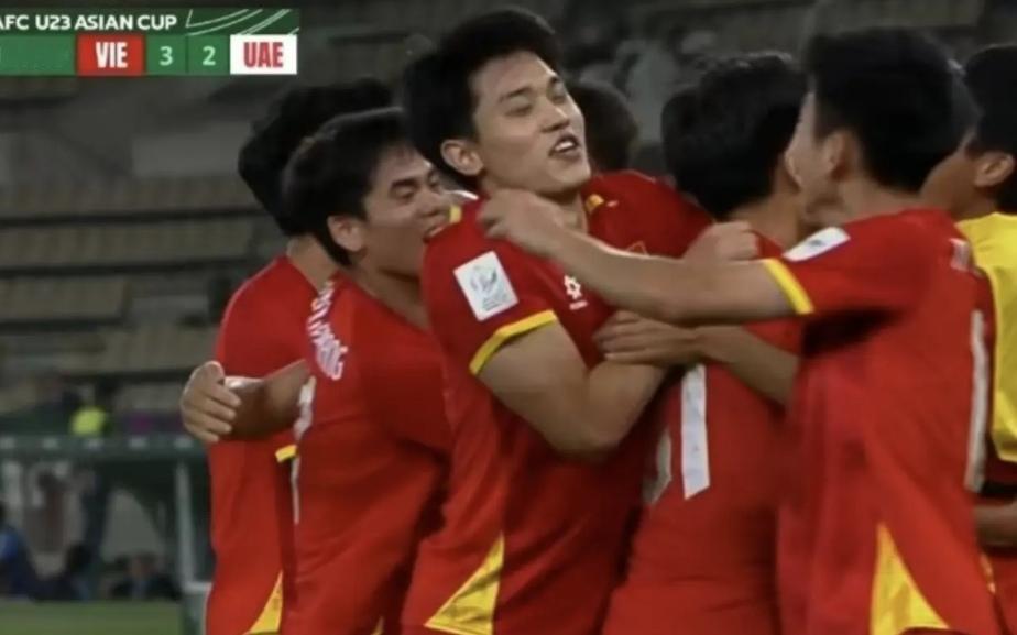 U23亚洲杯1/4决赛:越南队加时赛绝杀阿联酋队晋级四强 在北京时间1月18日凌晨刚刚结束的U23亚洲杯1/4决赛中,越南男足迎战阿联酋男足。上半场比赛结束双方战成1-1平。90分钟的比赛结束,双方战成2-2平。此后进入加时赛。越南男足在加时赛破门,3-2绝杀阿联酋男足,成功晋级四强。 主裁判一声哨响比赛开始了。场上穿着红色球衣的是越南队,穿着白色球衣的是阿联酋队。比赛开始后,双方都试探对方。第16分钟,阿联酋队率先取得破门,主裁判通过视频回放,认定阿联酋球员手球在先,进球被判无效,越南队逃过一劫。随后阿联酋队愈战愈勇,多次制造威胁,但是面对越南队的防守都是无功而返。比赛的第39分钟,越南队阮黎发门前接到队友的传中之后轻松推射破门,越南队1-0领先。但是好景不长,比赛的第44分钟,阿联酋队的恩迪亚耶头球破门,上半场比赛结束,双方战成1-1平。 下半场,易边再战。双方加强进攻,比赛的第62分钟,阮庭北头球破门,越南队2-1再度领先。但是比赛的第68分钟,阿联酋门哈利还以颜色,同样利用头球破门,阿联酋队2-2再次扳平比分,此后双方都有射门,但是都没有取得进球。90分钟的比赛结束,双方2-2战平,比赛进入加时赛。 加时赛越南队控制比赛的局面。第101分钟,越南队范明福禁区内射门打在防守球员的大腿上折射入网,越南队3-2领先,此后的20分钟的时间里,阿联酋加强进攻,但是越南队全体防守。阿联酋没有取得进球。这个比分保持到了比赛结束。最终越南队3-2战胜阿联酋队,晋级四强。越南足球队 阿联酋足球队 U23国足出线 U23足球比赛