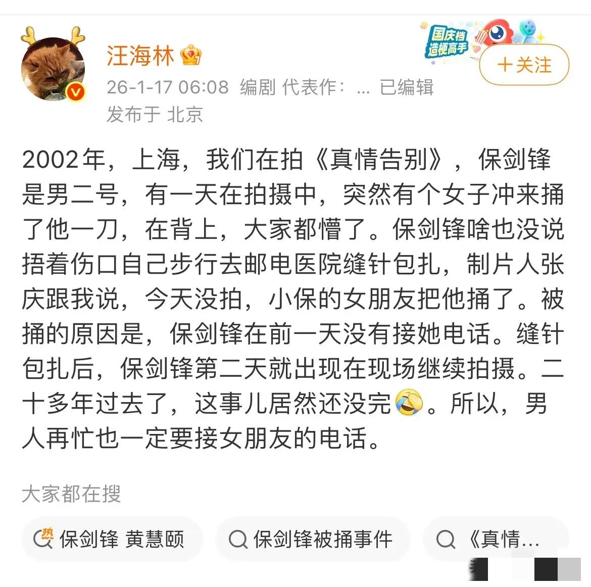 看完了编剧汪海林的最新爆料, 我脑子里就一个念头: 保剑锋被捅了居然自己不报警,