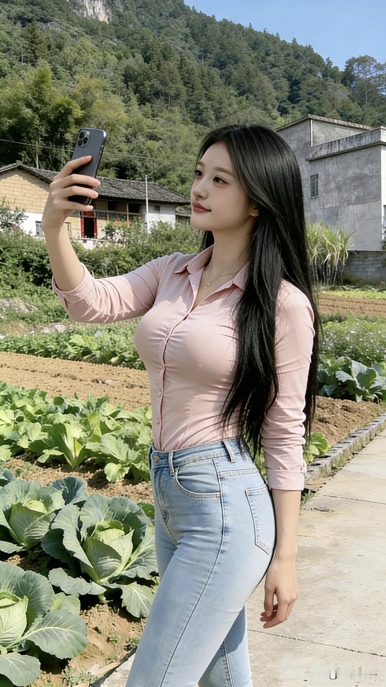 村郊自拍 粉衫浅衬小蛮腰, 菜畦风软拂长梢。 山光入镜春正好, 笑靥偷将云影描。