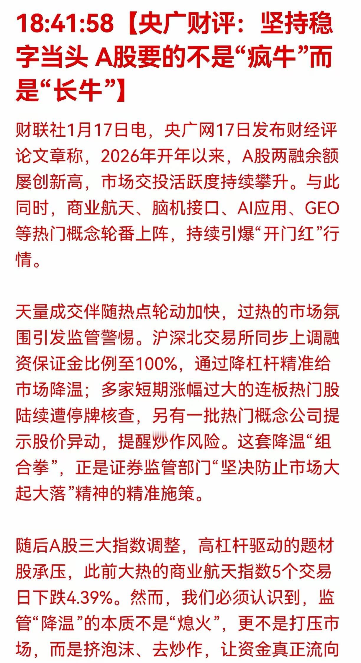 官媒发声,A股走势暗藏玄机? 官媒再度强调,A股不要“疯牛”要“长牛”。这不禁让人想起2024年11月官媒呼吁“慢牛”的文章,历史虽不会重演,但相似之处值得深思。 开年以来,A股交投活跃,热门概念频出,然而天量成交下,监管已悄然出手降温。上调融资保证金比例、停牌核查热门股,种种举措表明,监管希望市场稳扎稳打。 对于投资者而言,这是个重要信号。“长牛”意味着市场将更注重基本面,靠炒作爆炒的行情难再出现。周一的股市,预计会因这一信号而波动。投资者应顺应趋势,聚焦优质标的,摒弃短期投机思维,才能在“长牛”行情中分得红利。