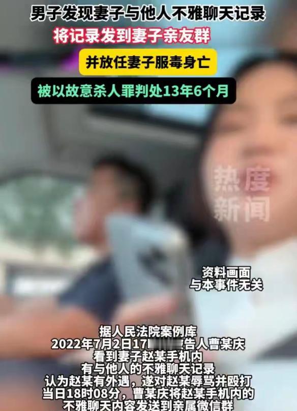 “见死不救也是杀人!”山西朔州,男子发现妻子与他人的聊天记录不堪入目,怀疑妻子出轨,辱骂并打了妻子一顿,事后又觉得不解气,把聊天记录发到亲友群里羞辱妻子。 男子妻子不堪忍受,当着男子的面儿喝下农药,男子却选择视而不见!男子妻子最终经抢救无效死亡,男子也悲剧了,被以故意杀人罪,判处有期徒刑13年6个月。 事情发生在2022年7月2号,朔州的曹某庆闲下来翻了妻子赵某的手机,一翻就翻出了麻烦——妻子和别人的不雅聊天记录,不堪入目。 曹某庆当场就火了,对着赵某又骂又打,把心里的火气全撒了出去。可打骂完他还不解气,心里憋着一股狠劲,要把妻子的脸面彻底撕碎。 当天晚上,曹某庆把那些不雅聊天记录截了图,直接发到了亲属微信群里,还特意@了赵某的妈妈和妹妹,让她们出来“解决这事”。 亲戚群里全是熟人,这下等于把赵某的隐私扒光了扔在众人面前,换成谁都扛不住这份羞辱。赵某又羞又愤,整个人彻底崩溃了,她没想到丈夫会这么绝情,一点退路都不给她留。 羞辱还没结束,更冷血的一幕紧跟着发生。绝望之下的赵某,转身拿起家里用来除杂草的农药,当着曹某庆的面就喝了下去。曹某庆看得清清楚楚,可他就像个没事人一样,站在旁边冷眼旁观,连一句阻拦的话都没有。 很快,农药就起了反应,赵某开始剧烈呕吐,脸色发青,呼吸也越来越困难,明显是中毒了。这时候只要曹某庆打个120,或者喊邻居帮忙送医,说不定还有救。 可他全程一动不动,既不急救也不呼救,就眼睁睁看着妻子在痛苦中挣扎。直到两个多小时后,其他亲戚察觉到不对劲赶过来,才慌忙把赵某送进医院,可一切都太晚了,赵某最终抢救无效没了命。 案子到了法院,公诉机关一开始是以故意伤害罪起诉曹某庆的。但法院审理后,直接定了故意杀人罪,2023年6月一审判了他十三年六个月。曹某庆不服上诉,结果同年8月朔州中院驳回上诉,维持了原判,这案子还被收录进了人民法院案例库,成了典型判例。 很多人都想不通,曹某庆没动手杀人,就是没救,怎么就成故意杀人了?这里要把法律讲明白,不是只有动手才叫杀人,不作为同样可能构成故意杀人罪。 法律明确规定,夫妻之间有相互扶养、相互救助的法定义务,这种义务是强制性的,不是想履行就履行,不想履行就不履行。 曹某庆明知是剧毒农药,也看到妻子中毒后痛苦的样子,他完全有能力打急救电话、送妻子去医院,却故意放任不管,等着妻子死亡结果发生。 这种“明知会死人,还放任不管”的心态,在法律上就叫间接故意,和主动杀人的主观恶性一样,所以法院才会按故意杀人罪定罪量刑。 根据我国刑法第232条,故意杀人的,最低都要判三年以上十年以下有期徒刑,情节严重的能判死刑、无期徒刑,曹某庆的判决刚好在十年以上的量刑区间里。 别觉得这是个例,类似的案子全国各地都发生过,每一起都在提醒大家,亲属间见死不救,后果真的会坐牢。哈尔滨就有过一起案子,男子李某某把瘫痪在床、生活不能自理的亲生父亲,遗弃在人迹罕至的废弃采石场,连食物和水都不留,还多次回去查看,确认父亲死亡。 最后法院认定他构成故意杀人罪,判了死刑缓期二年执行,和他一起参与的两个人,一个判了无期徒刑,一个判了十五年。 有人说曹某庆是被妻子出轨激怒的,值得同情。可再大的怒气,也不能越过法律和人性的底线。妻子就算有错,也能通过离婚、协商解决,打骂、曝光隐私已经是违法,见死不救更是把自己逼上了绝路。他以为是在报复妻子,结果把自己送进了监狱,一个家庭彻底破碎,没有赢家。 更要提醒大家,不光是夫妻之间,父母对未成年子女、子女对年迈无自理能力的父母,都有法定救助义务。华律网的司法数据显示,近年来不作为构成故意杀人罪的案件中,亲属间犯罪占比超过六成,大部分都是因为一时意气、心存侥幸,觉得“我没动手就没事”,最后都付出了惨痛代价。 这起悲剧的核心,从来不是出轨纠纷,而是对生命的漠视,对法定义务的无视。一时的冲动和冷血,毁掉的是两个家庭一辈子的幸福。遇事冷静三分,再大的矛盾也别丢了人性和法律的底线,不然最终只会自食恶果。 对于此事,你有怎样的见解?欢迎在评论区分享你的观点。