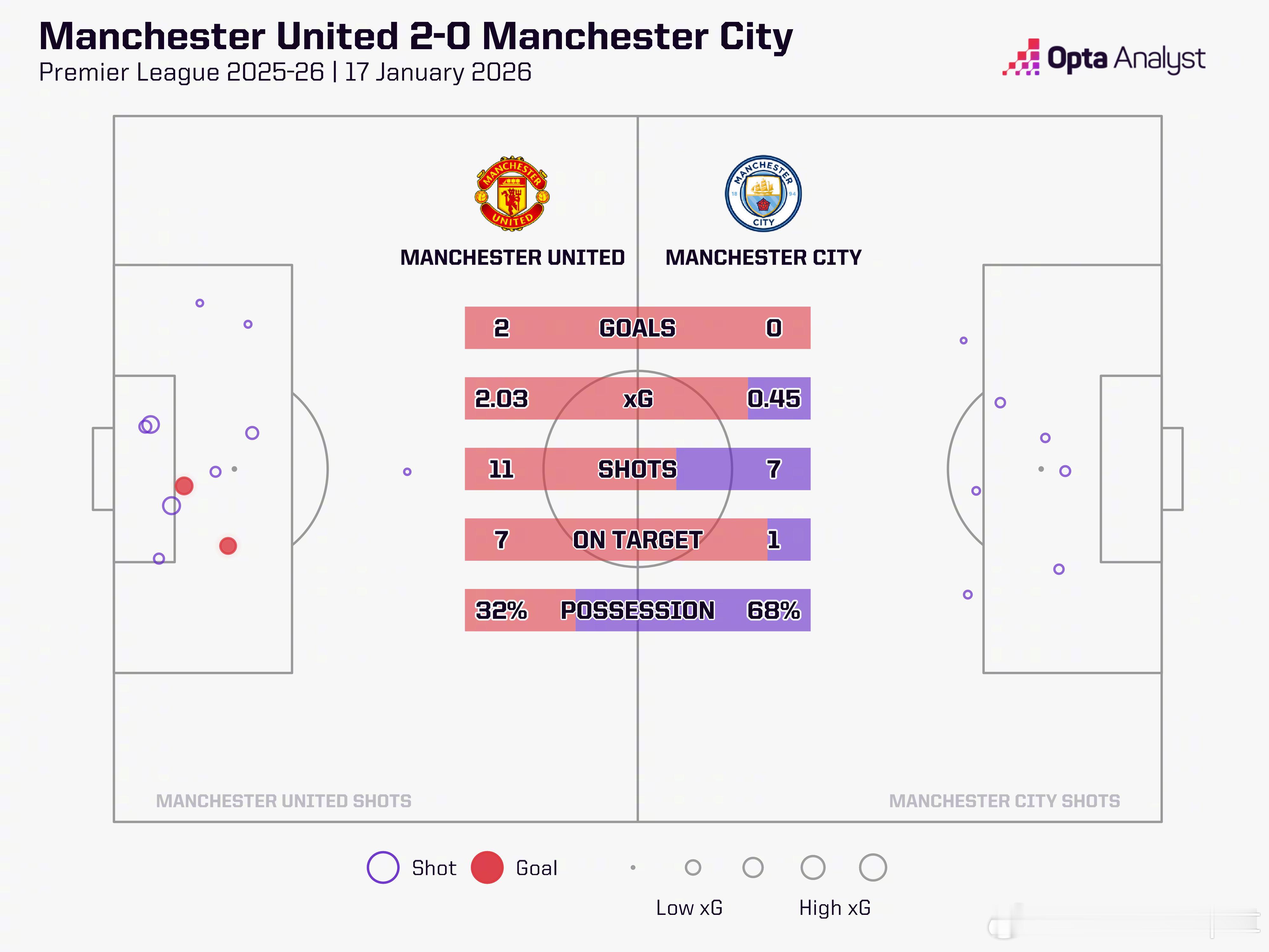 根据Opta给出的本场数据对比,曼联预期进球达到2.03,曼城只有0.45,曼联11射7正,曼城7射仅1正,曼联本场的表现取胜在情理之中。ManUtdspot曼联vs曼城曼联2比0曼城