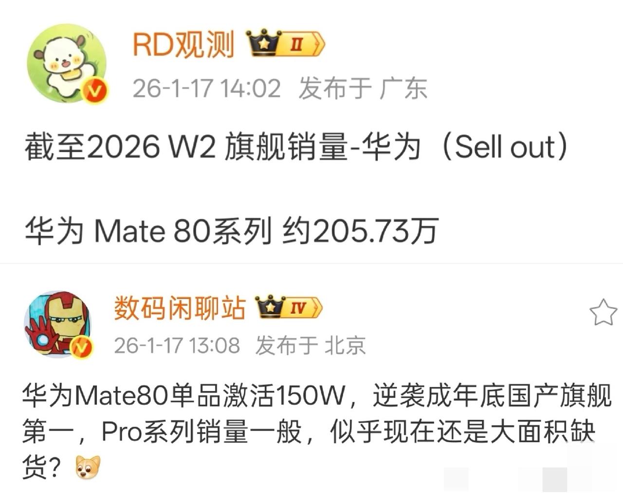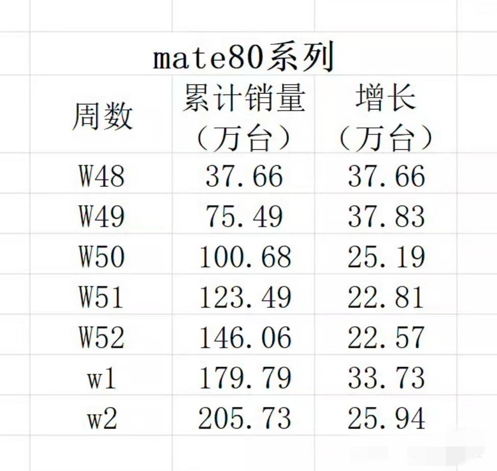 Mate80系列销量正式超过200w,国产旗舰第一 其中mate80标准版激活超过150w,年底国产旗舰销量第一,Pro系列依旧缺货严重。 整体增速非常稳定,相比去年mate70系列进步明显,并且随着ProMax逐渐放货,mate80pm已经进入销量榜top30,参考mate70生命周期1000w左右,预计生命周期达到1400w上下比肩p70系列,依旧是国产唯一销量超千万的系列。 大家觉得这样的水平符合预期吗?