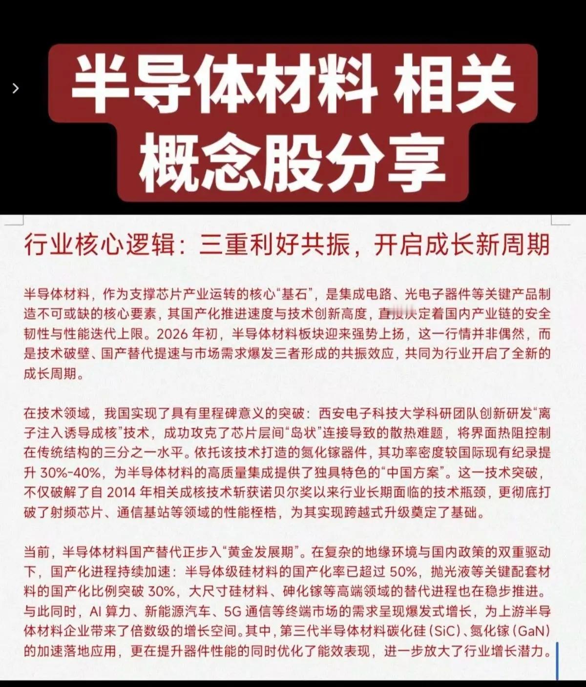 1月18日,下周A股这个板块有望大爆发!!! 半导体材料,作为支撑芯片产业运转的核心“基石”,是集成电路、光电子器件等关键产品制造不可或缺的核心要素,其国产化推进速度与技术创新高度,重点关注:蓝箭电子、亚翔集成、和林微纳!!!