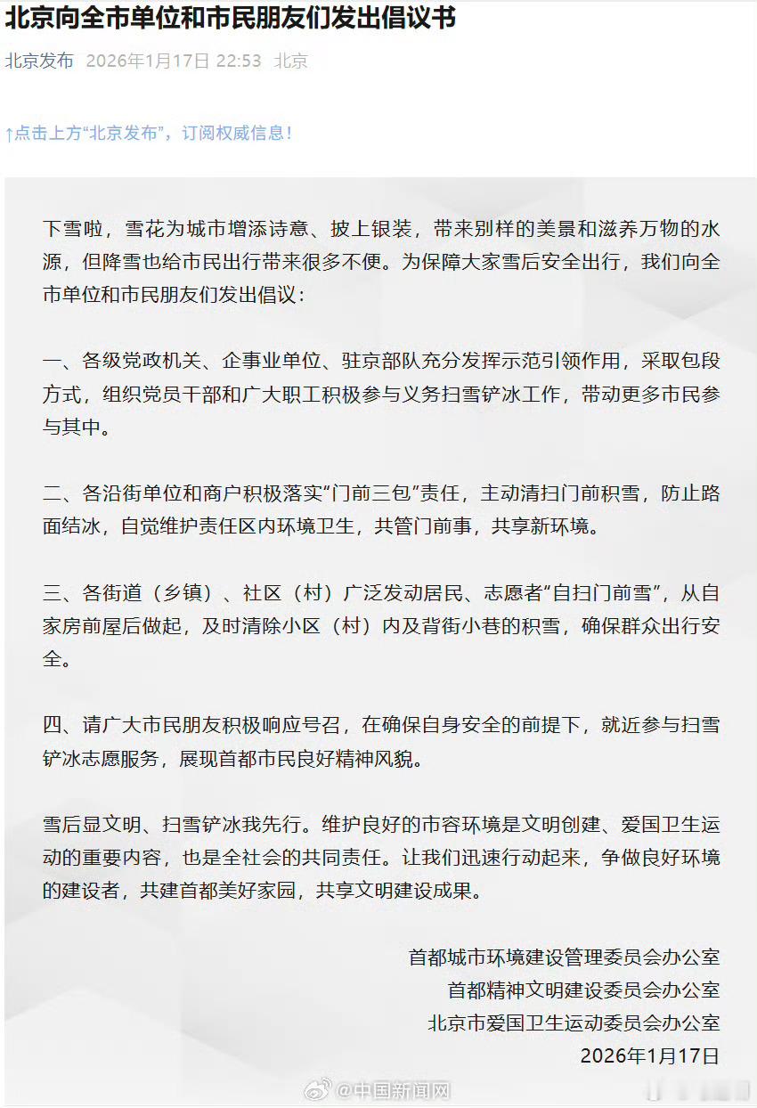 北京向全市单位和市民发倡议书北京倡议发动居民志愿者扫雪小的时候,居委会大妈一大早拿着铁锨,往雪里一站,喊几嗓子,居民们自带工具就开始扫雪了,不用官方搞啥倡议。