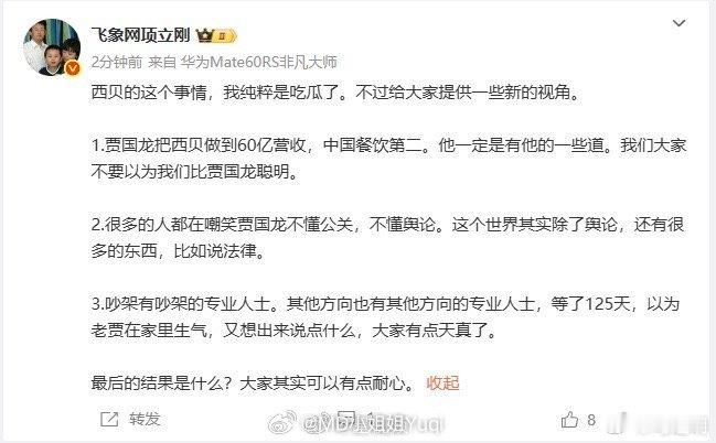 项立刚老师说,西贝的这个事情,他纯粹是吃瓜的。他说,吵架有吵架的专业人士。其他方向也有其他方向的专业人士,等了125天,以为老贾在家里生气,又想出来说点什么,大家有点天真了。不过,从项立刚攻击话术的连贯性、针对性,咋看都不像随机吐槽,更像是刻意为之。项立刚老师一直看不起学文科的人,但是真正学文科的人不仅会写小作文,还有逻辑和思考能力,最起码能把一段话,一段文字搞的能够逻辑自治。显然,他的文科水平也一般,至少他这篇网文没有形成逻辑自洽。项立刚老师这段文字挺有意思,先是说自己是旁观者,捧着西贝花,说着“老贾”的125天私生活“告白”,再给点“让大家其实可以有点耐心”的悬疑。这是“局外人”吗?咋越看他越像是要对罗永浩降维打击的写手呢?其实,项立刚老师个子不高,心眼挺多的。罗永浩吐槽宽带不够宽,运营商很快解决了罗永浩反映的问题,罗胖也认可了服务,这事儿简单的不能再简单了。可所谓的“通信专家”项立刚老师的出现,让整个事件开始升级。先是罗永浩不懂“专享”其实是“共享”,不懂项立刚式的高科技。然后,项立刚嘴里的罗胖成了一无是处的失败者。再然后,项立刚曝光罗永浩所谓“精日言论”,一顶“缺少爱国情怀和民族大义”给罗胖扣将过去。他还故意关联“遥遥领先”争议,批判罗永浩“讽刺、嘲笑、抹黑某位,是对中华文明的仇恨,对中国人创新的仇恨”;项立刚最高明之处,一句“罗永浩要是被封,和我没关系,纯属他自己求锤得锤”,瞬间让他成了“反罗”的首席舆论官。的确,又……又……的立和立,最有想象力。只可惜,项立刚十几篇文章搞罗胖,却没有达到预期效果,有人说是项立刚的文章逻辑有问题,还有人说,舆论场已经对这种“扣帽子,打棍子”所谓的“政治斗争”有了免疫力,“阶级斗争一抓就灵”,也就不灵了。当时罗永浩忙着办科技春晚,没时间搭理项立刚和自称给罗永浩投资的黄某,李某的挑衅,否则,一场毫无营养和意义的口水仗或许早就开始了。只是不知,2026年1月26日西贝回应之前,项立刚对罗永浩咬牙切齿的“恨”来自哪里?我一直很纳闷,项立刚这种“大烩菜”式的攻击罗永浩,背后真的没有啥吗?要不,烤条草原大羊腿,边吃边聊?