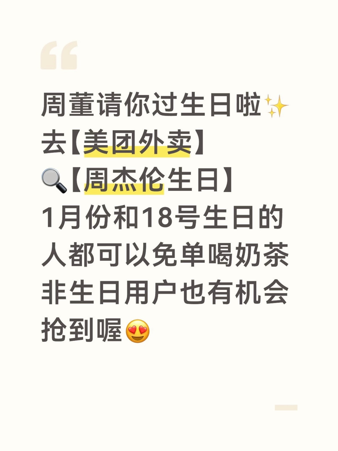 别的小姐妹还在沉睡,我已经领到周杰伦请的免单奶茶了!上美团 App 或 美团外卖 App 搜“周杰伦生日礼”,1月生日的宝子领100万份免单珍珠奶茶 ,不是1月生的姐妹也有10万份免单奶茶生日礼可以抢 ,哥生日直接把全网福利承包了,奶茶星人速冲⚡️ 0118周杰伦送双重福利