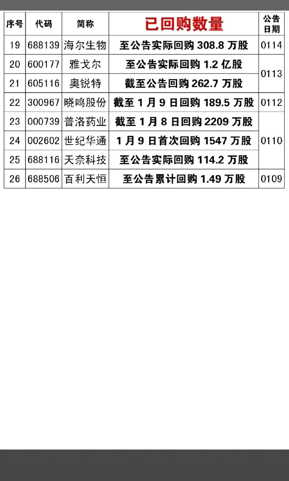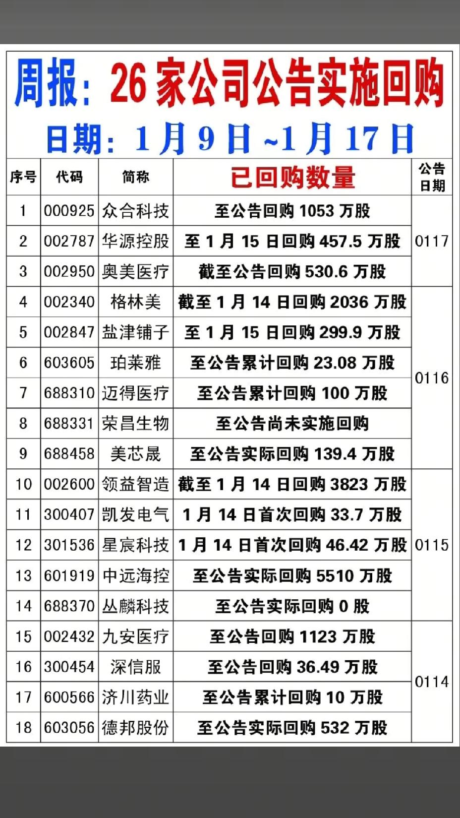 1月18日,下周A股这些股票有望大爆发!!! 本周,26家公司公告实施回购,重点关注:众合科技公告回购1053万股,后市值得期待;领益智造回购3823万股,后市值得高看一眼;九安医疗回购1123万股,后市值得重点关注!!!