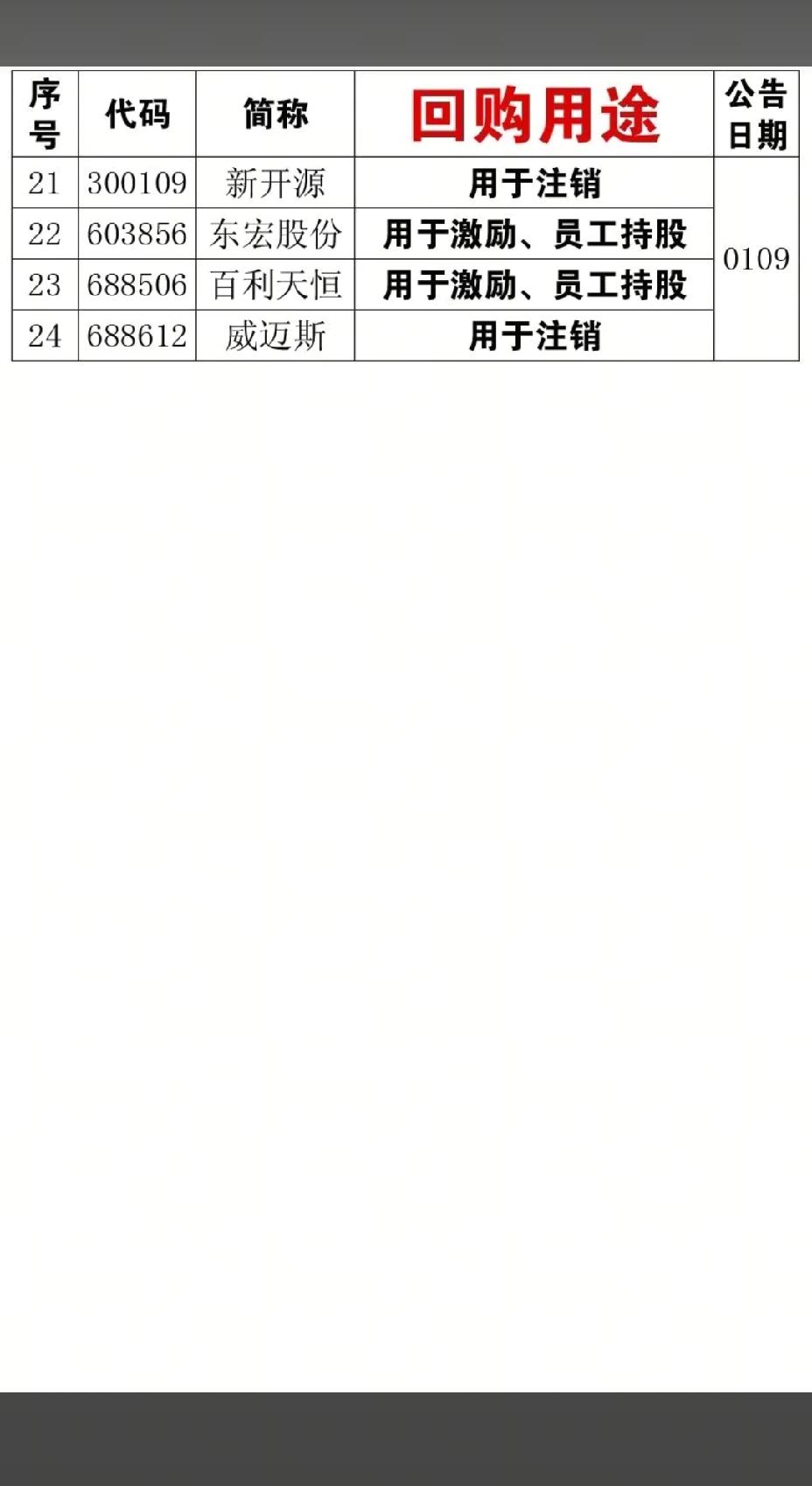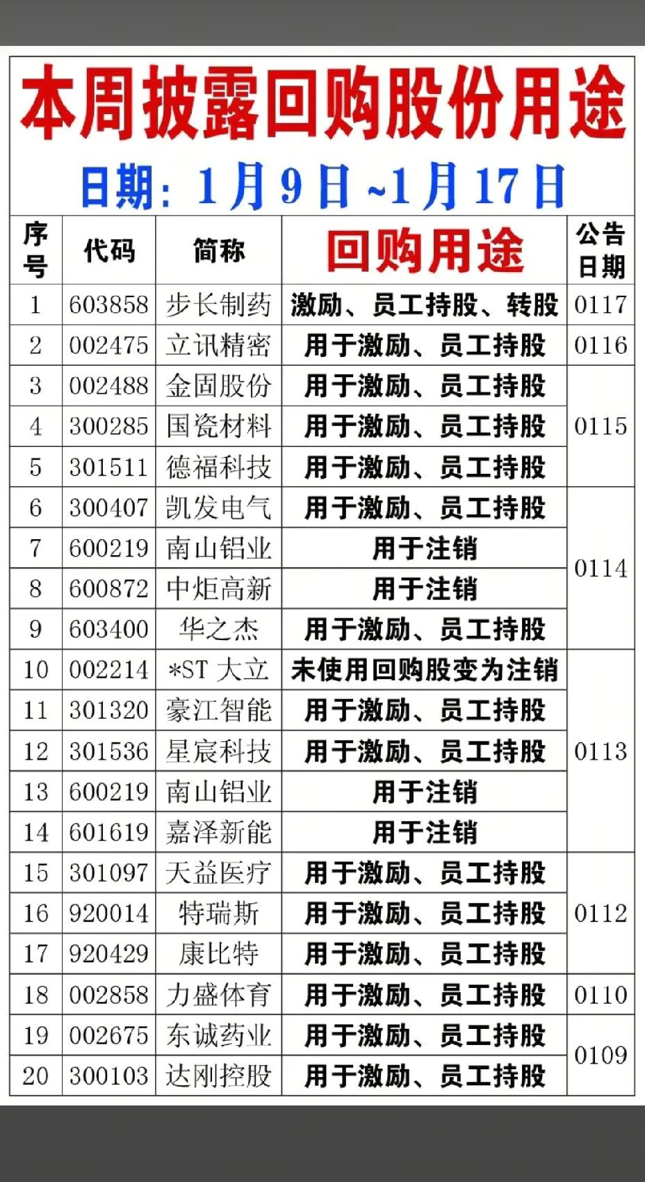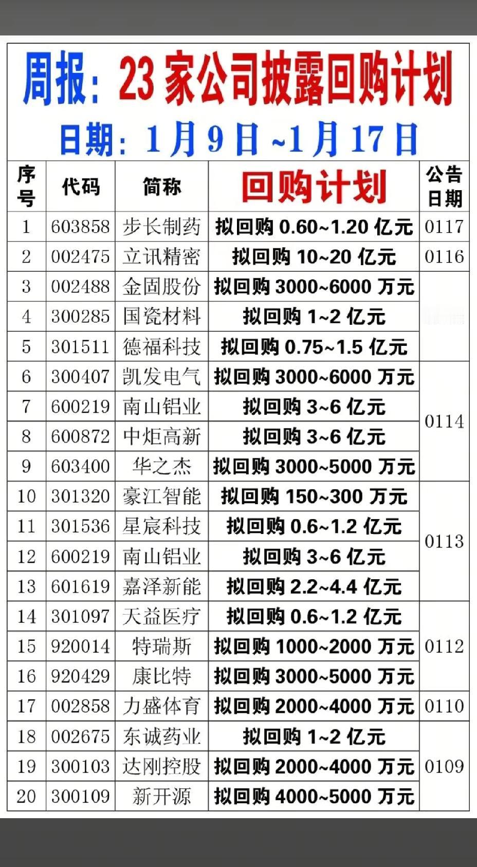 1月18日,明日A股这些股票有望大涨!!! 23家公司本周披露回购计划,重点关注:立讯精密拟回购10-20亿元,后市值得高看一眼;中炬高新拟回购3-6亿元,后市值得期待;南山铝业拟回购3-6亿,后市值得重点关注;24家公司披露回购股份用途!!!