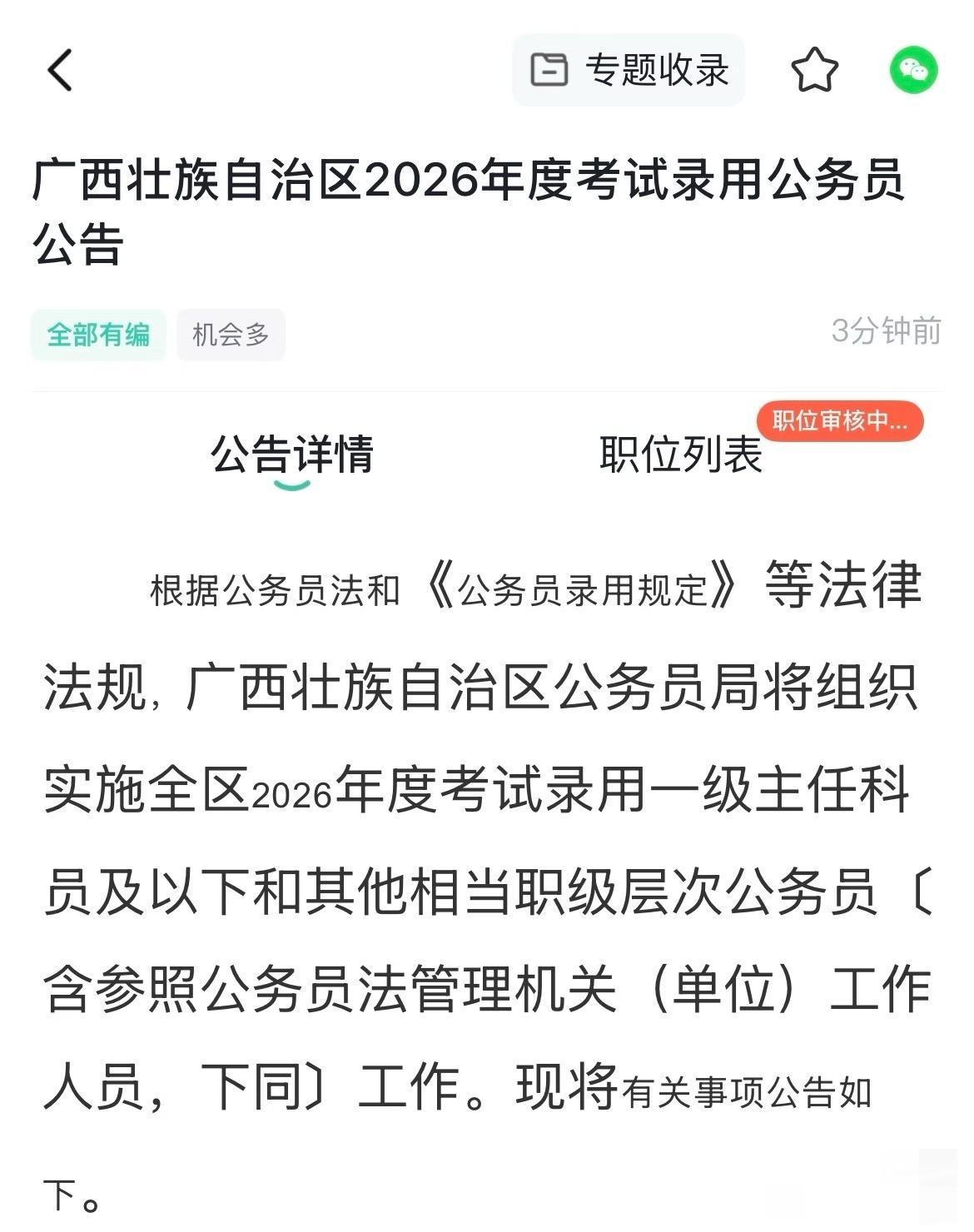刚刚刷到2026广西区考公告,好家伙,招录5630人,比去年少了1902个名额,这缩招力度有点猛啊!职位数3358个,僧多粥少的局面怕是更明显了。想考公的小伙伴可得抓紧时间研究岗位了。