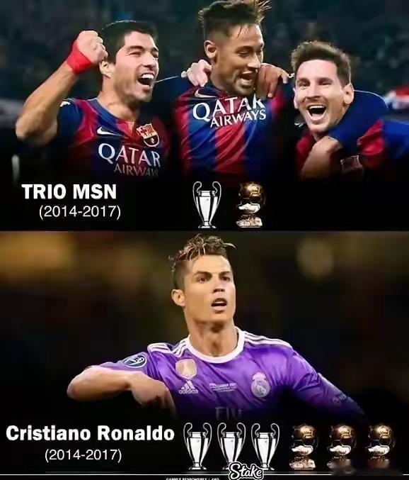 克里斯蒂亚诺·罗纳尔多与全盛时期MSN对抗仍然获胜!2014~2017年可以说的算是C罗时代, C罗帮助皇马获得了三个欧冠冠军,还在葡萄牙获得了2016年的欧洲杯冠军,可以说是称霸了一个时代,按照NBA的说法,就是建立了一个C罗王朝。在那几年,没有一个足球明星的风头压得过克里斯蒂亚诺.罗纳尔多,C罗就是球王,战神C罗。梅西很优秀,只可惜生在C罗时代