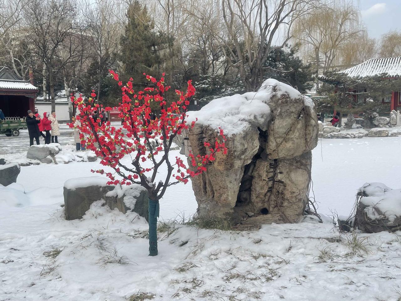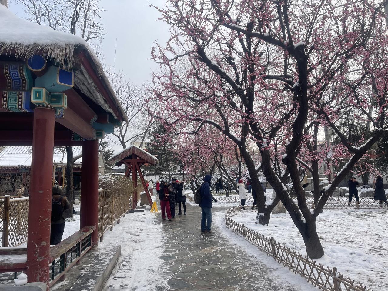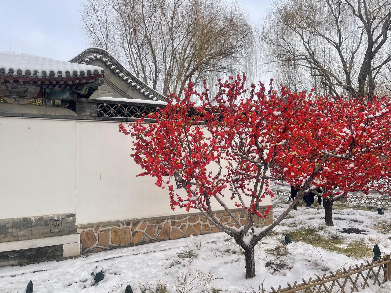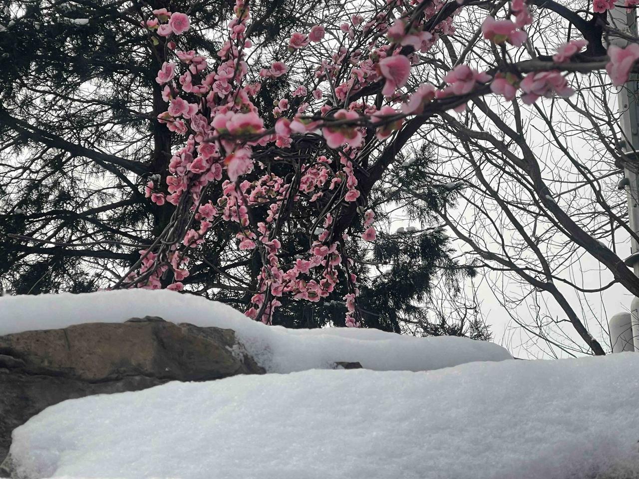 今冬第二场有模有样的雪,新年的第一场雪,大观园“踏雪寻梅”!!三百多棵梅花,一团团粉色烟雾,亭台覆雪,花开满园,白雪红梅,亦真亦幻!! 明知是绢花造景,仍纷纷至沓,有如红楼梦中繁华幻境!只有栊翠庵内,那一抹并不起眼而俏丽枝头的鹅黄色蜡梅花朵,才是寒冬里最真实的亮丽色彩!!