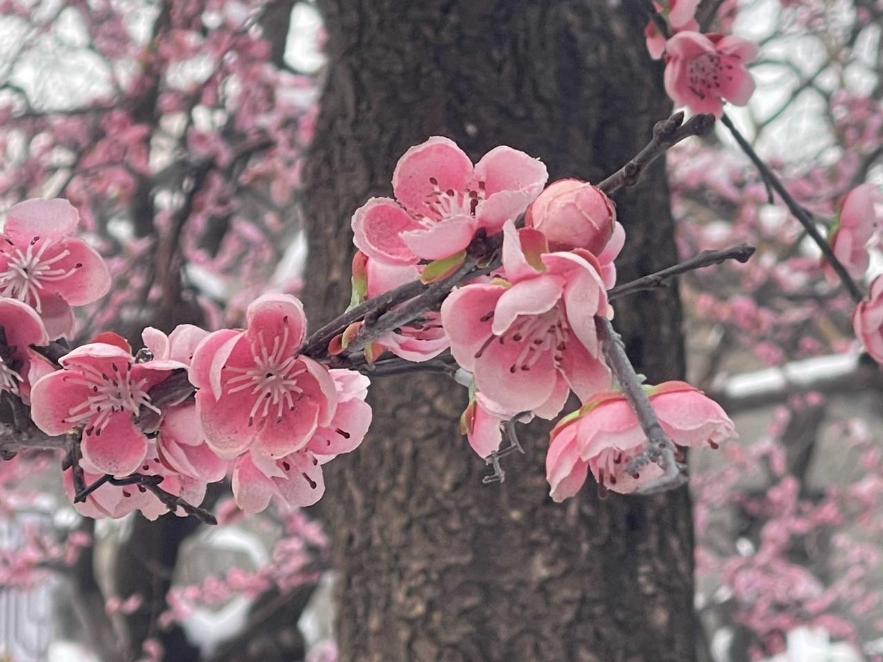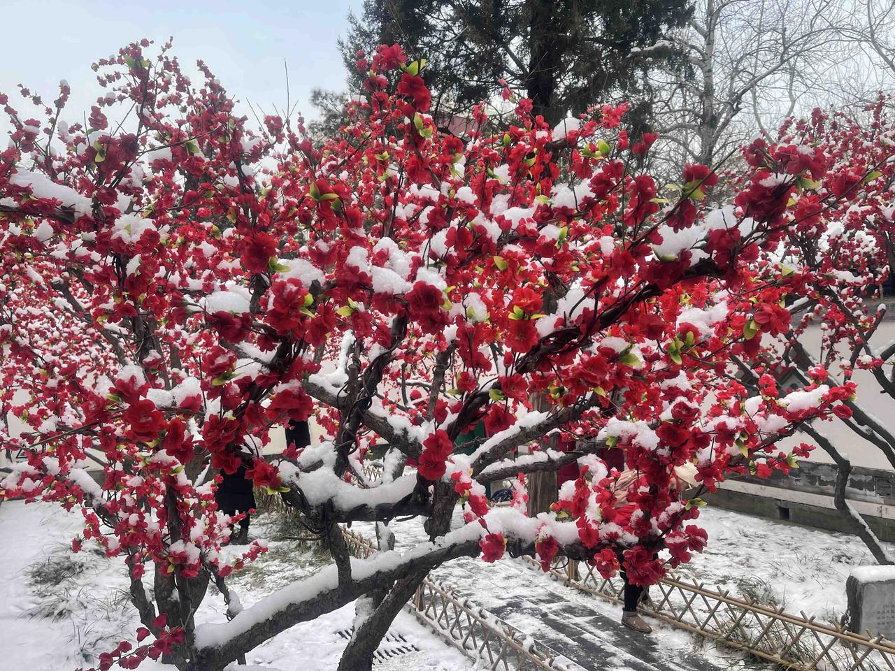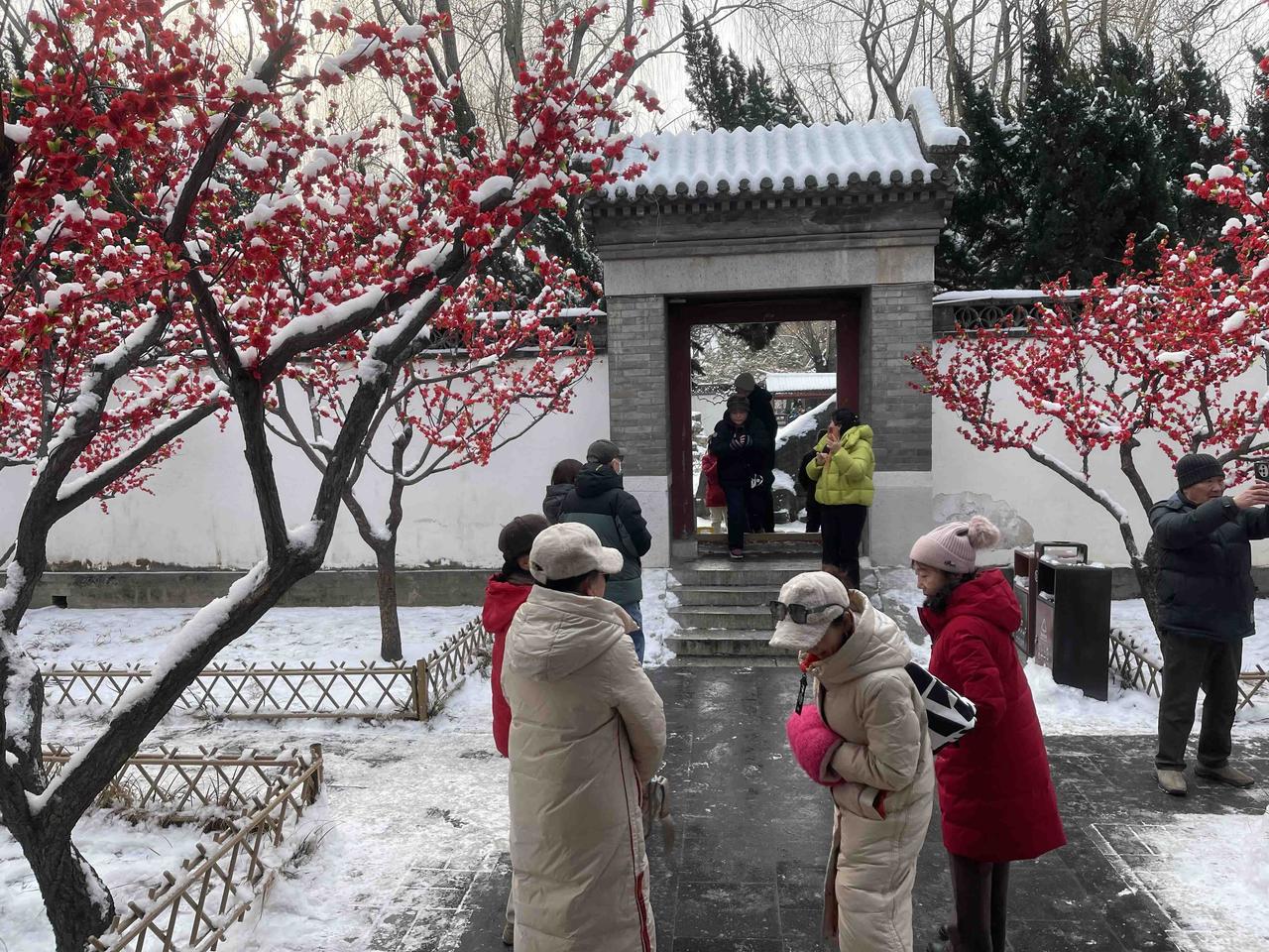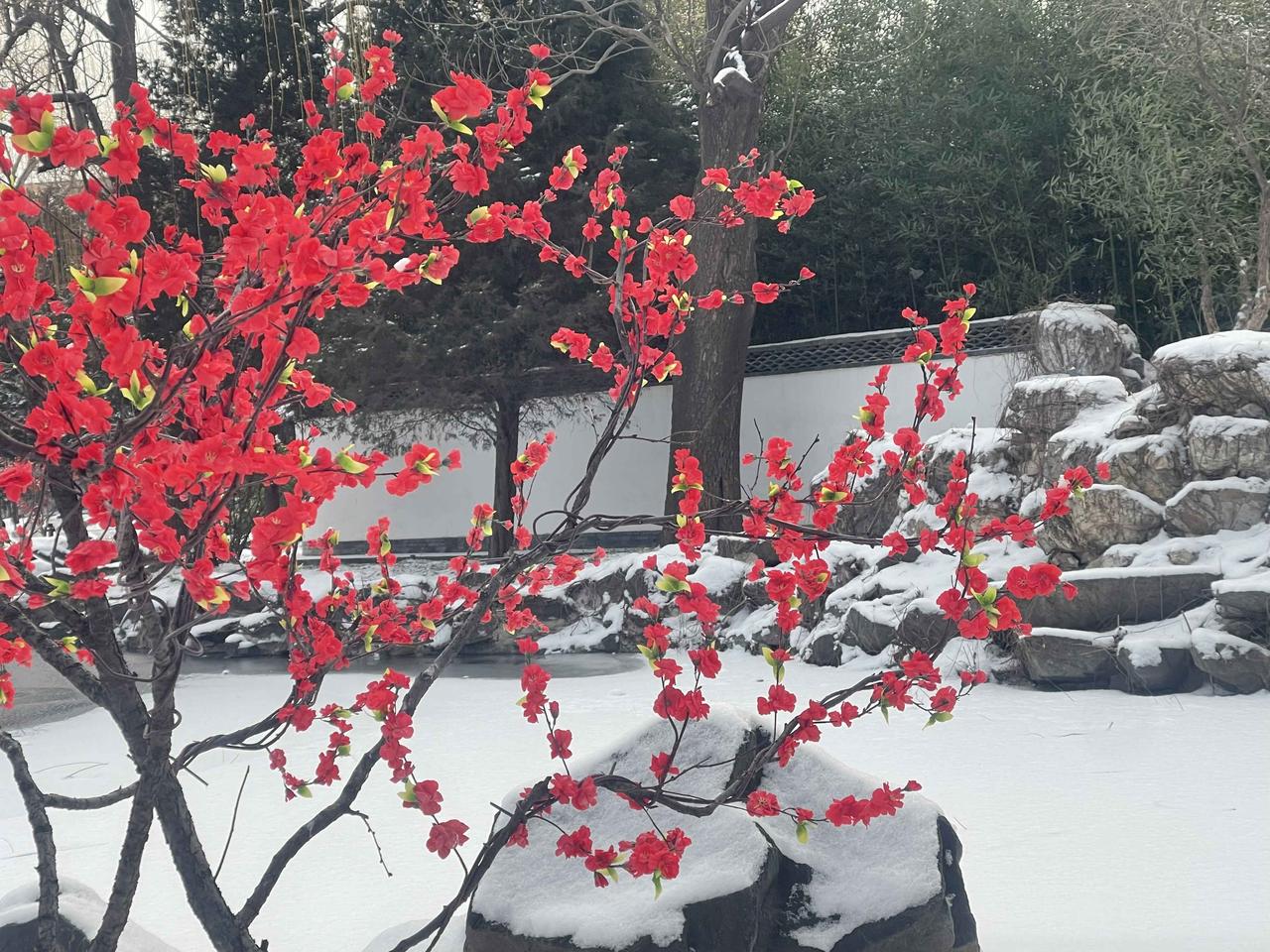 今冬第二场有模有样的雪,新年的第一场雪,大观园“踏雪寻梅”!!三百多棵梅花,一团团粉色烟雾,亭台覆雪,花开满园,白雪红梅,亦真亦幻!! 明知是绢花造景,仍纷纷至沓,有如红楼梦中繁华幻境!只有栊翠庵内,那一抹并不起眼而俏丽枝头的鹅黄色蜡梅花朵,才是寒冬里最真实的亮丽色彩!!