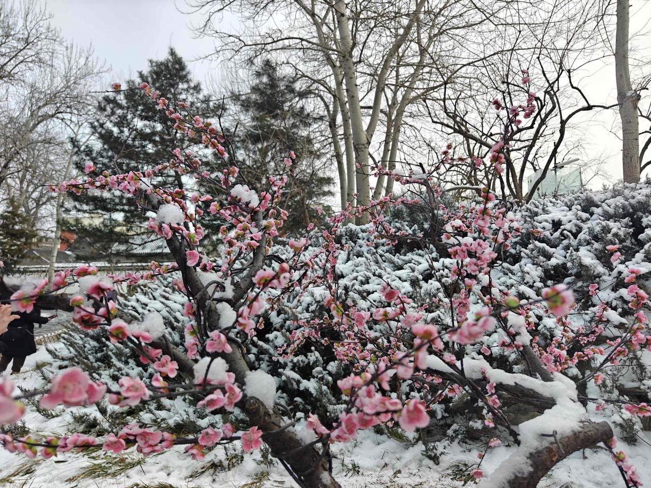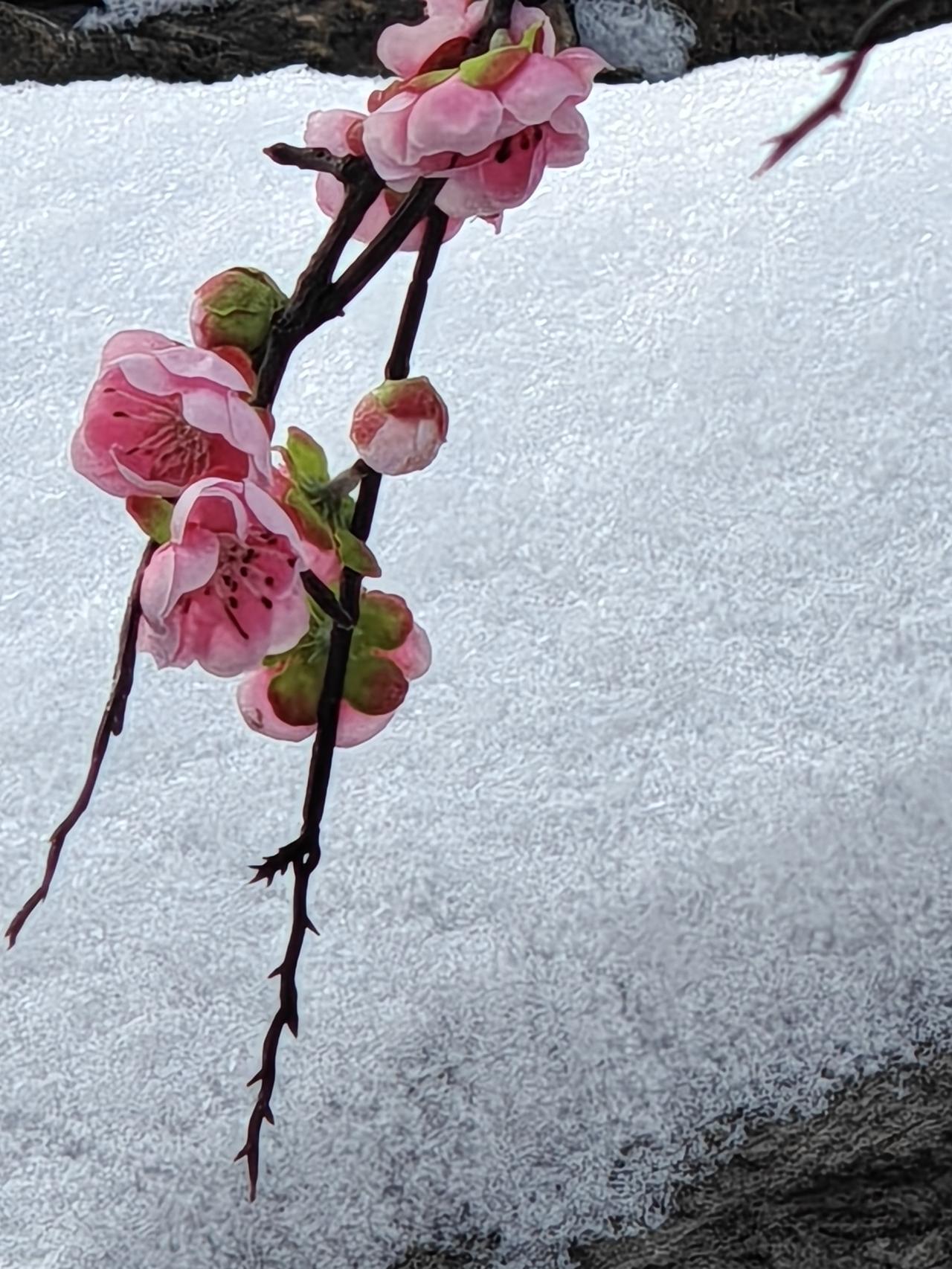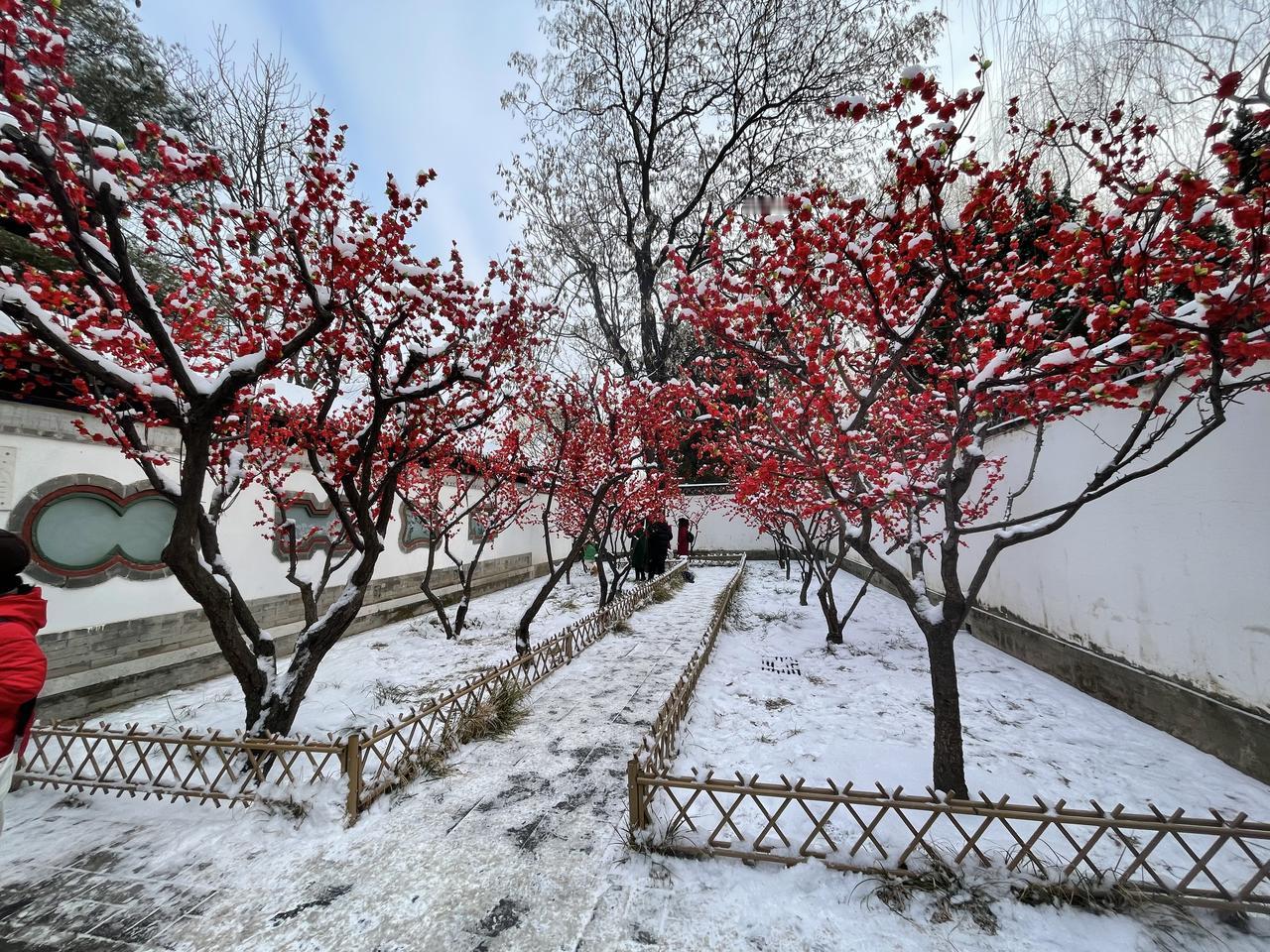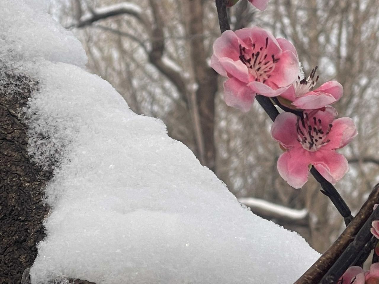 今冬第二场有模有样的雪,新年的第一场雪,大观园“踏雪寻梅”!!三百多棵梅花,一团团粉色烟雾,亭台覆雪,花开满园,白雪红梅,亦真亦幻!! 明知是绢花造景,仍纷纷至沓,有如红楼梦中繁华幻境!只有栊翠庵内,那一抹并不起眼而俏丽枝头的鹅黄色蜡梅花朵,才是寒冬里最真实的亮丽色彩!!