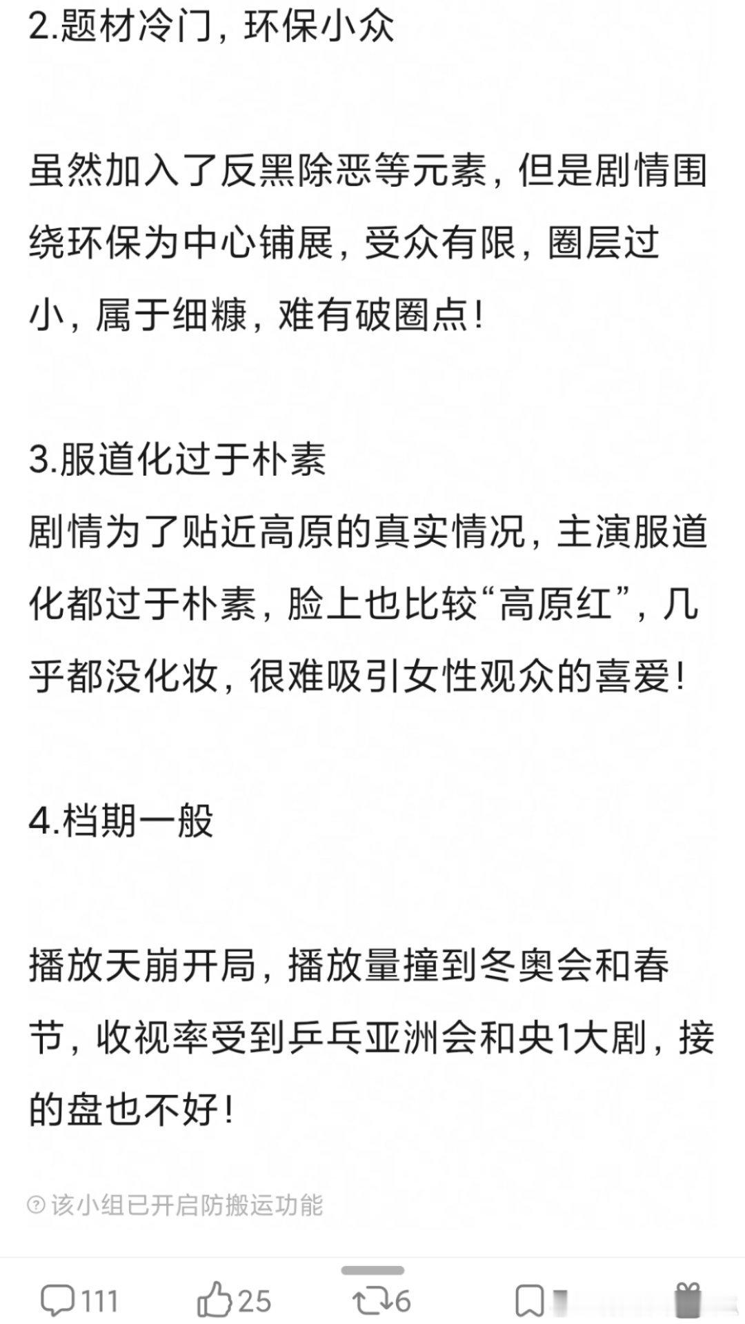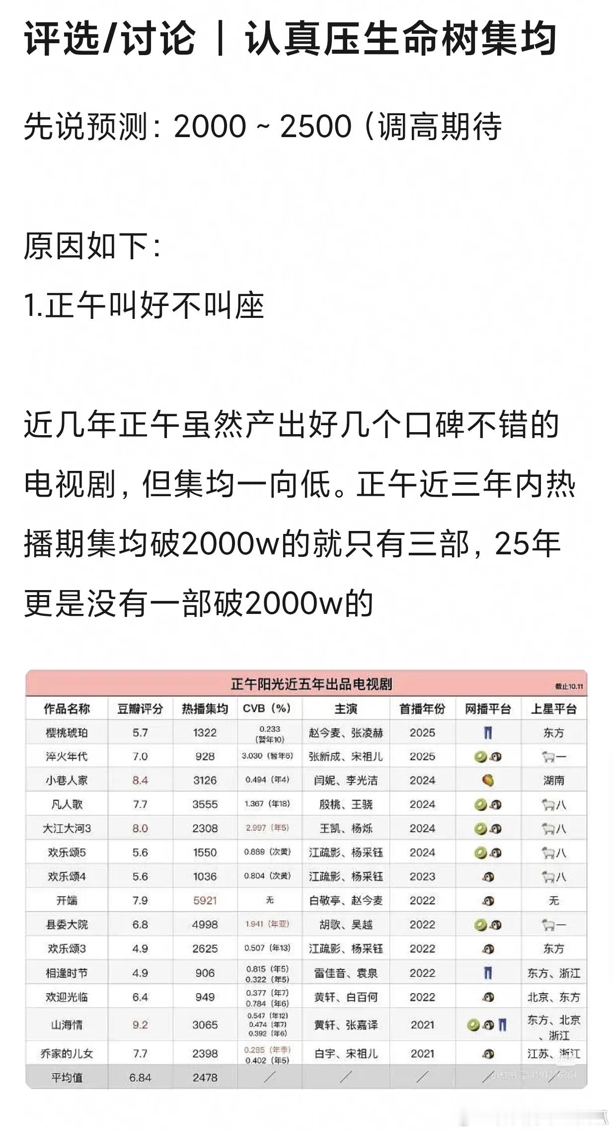 网友预测,杨紫《生命树》集均播放量2000~2500w,你们感觉符合预期吗?正午近几年的剧播放量都不高,大多2500w保卫战。小众环保题材不好走群众路线,还撞上冬奥会。 这几点确实都有可能影响网播。但服化道写实朴素,我觉得是个优点,另外上星央8至少收视率是有保障的,cvb保二争三还是没啥问题的杨紫造纸术叙述