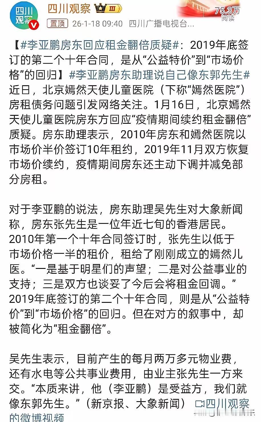 房东和李亚鹏各执一词,房东说一开始的十年是低于市场价一半的价格租给李亚鹏,到了十年就恢复市场价并没有恶意涨价,李亚鹏的长视频是说房东恶意涨价,房东觉得自己是东郭先生。 实际上望京那个片区对面是三块多,房东租给他七块多,而且这种大面积的商铺真的很难租出去,现在公说公有理,婆说婆有理。 李亚鹏毕竟是在做公益,更多人支持他,现在实体经济那么难,房东如果不租给他,估计就要空在那里了。