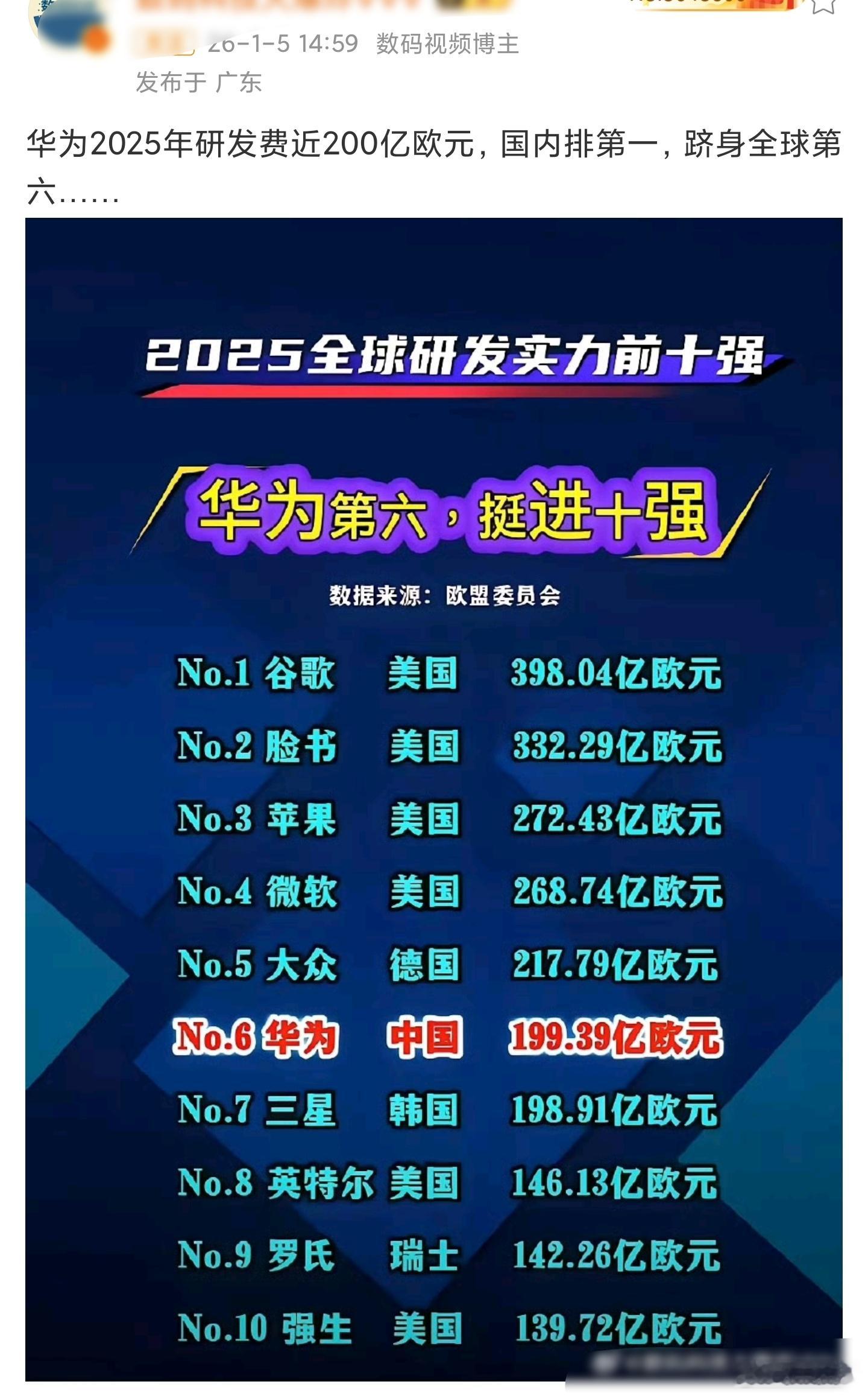 华为2025年的研发投入已经有很多博主发出来了,统计口径均来源于欧盟委员会,有229.41亿欧元和199.39欧元两个数据,差不多就是有242亿人民币的差距,可不是个小数字,一些博主可不要胡乱编造啊,这可开不得玩笑!!!华为研发好奇心观察局