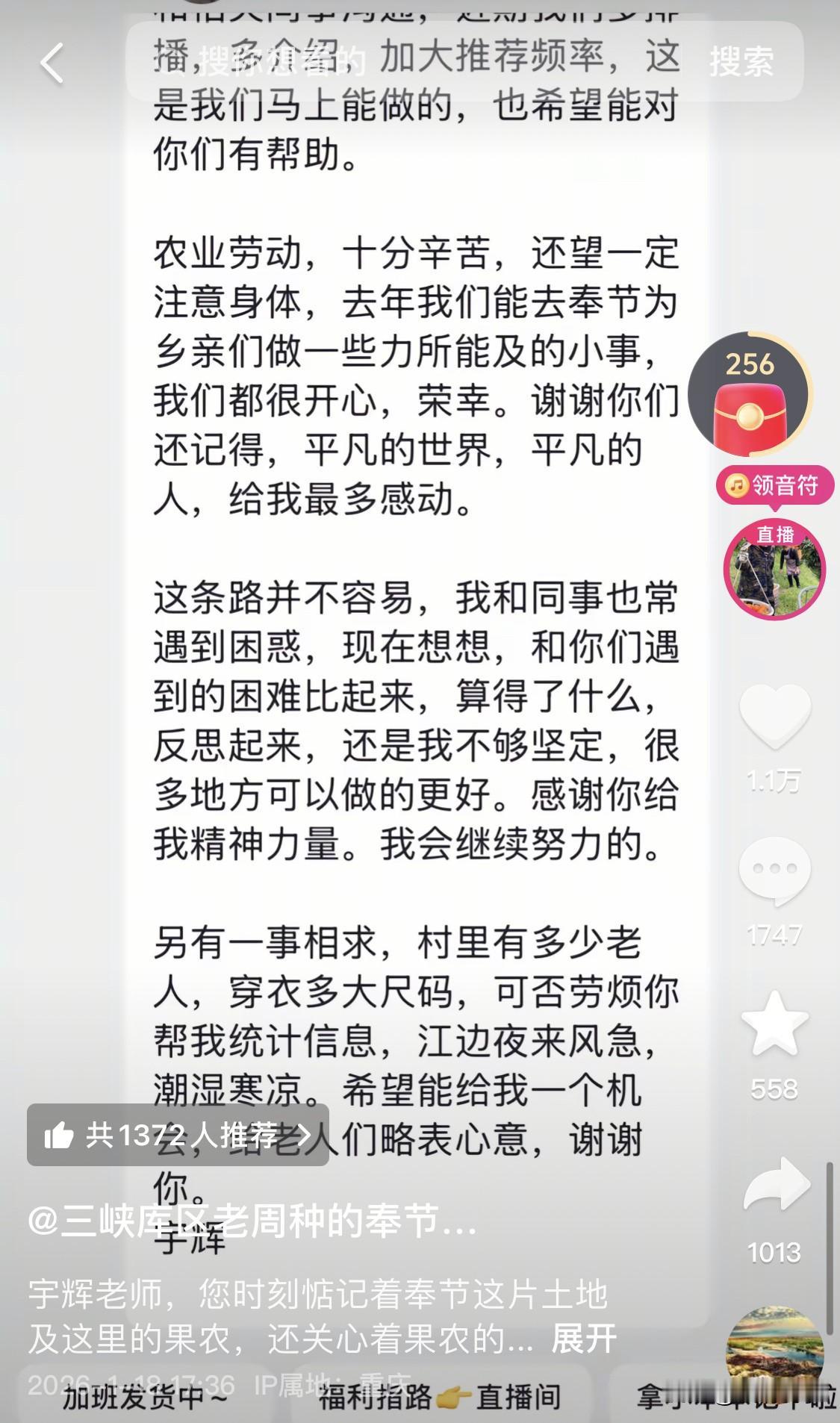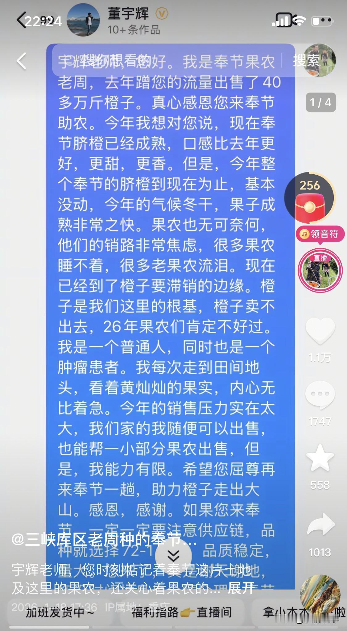 就在刚刚,我去奉节老周的直播间拍了两单纽荷尔脐橙。 我也是无意间刷到了老周写给董宇辉的信,以及董宇辉给老周的回信。 老周是一个种植脐橙的果农,董宇辉是大家相信的董宇辉。老周提到当地的脐橙丰收了,面临滞销的边缘,希望与辉同行能够去溯源。但是宇辉太忙了,可能抽不开身。他会和团队沟通看如何帮助当地的果农。 最后,宇辉说有一事相求,是什么呢?原来,他想到了江边风寒,问村里有多少老人,让老周统计老人们的衣服尺码,他要给老人们寄棉衣过去。 这就是宇辉,心心念念想着果农的宇辉,他这样的人,值得我们逐光。把百姓的事情放在心上,却还是有黑子放弃良心去黑他。 看了老周和宇辉之间的交流,说实话非常感动,去了老周的直播间,毫不犹豫地下单了脐橙,在直播间我也看到很多211同学进来,说是刷到了视频,特意找老周购买脐橙。