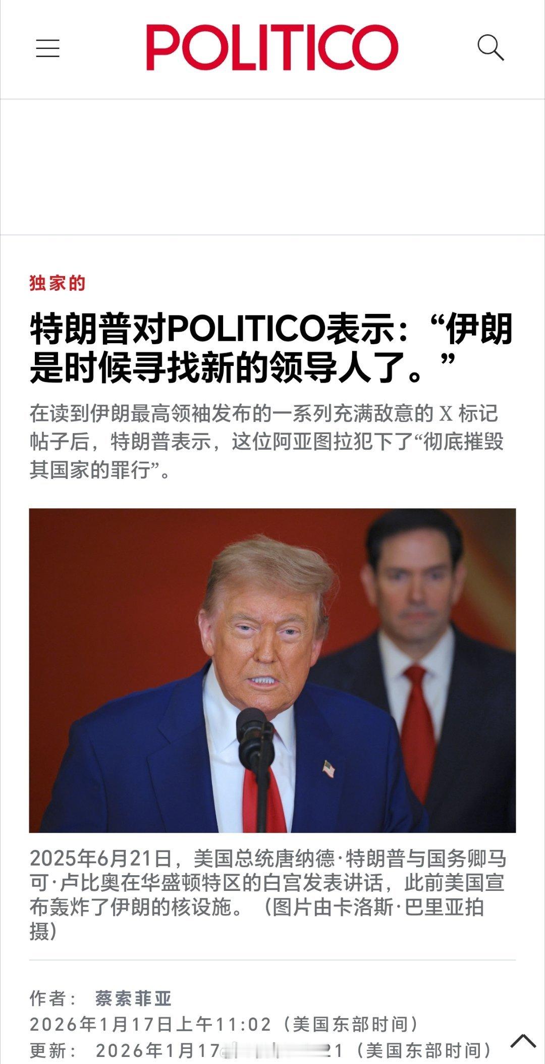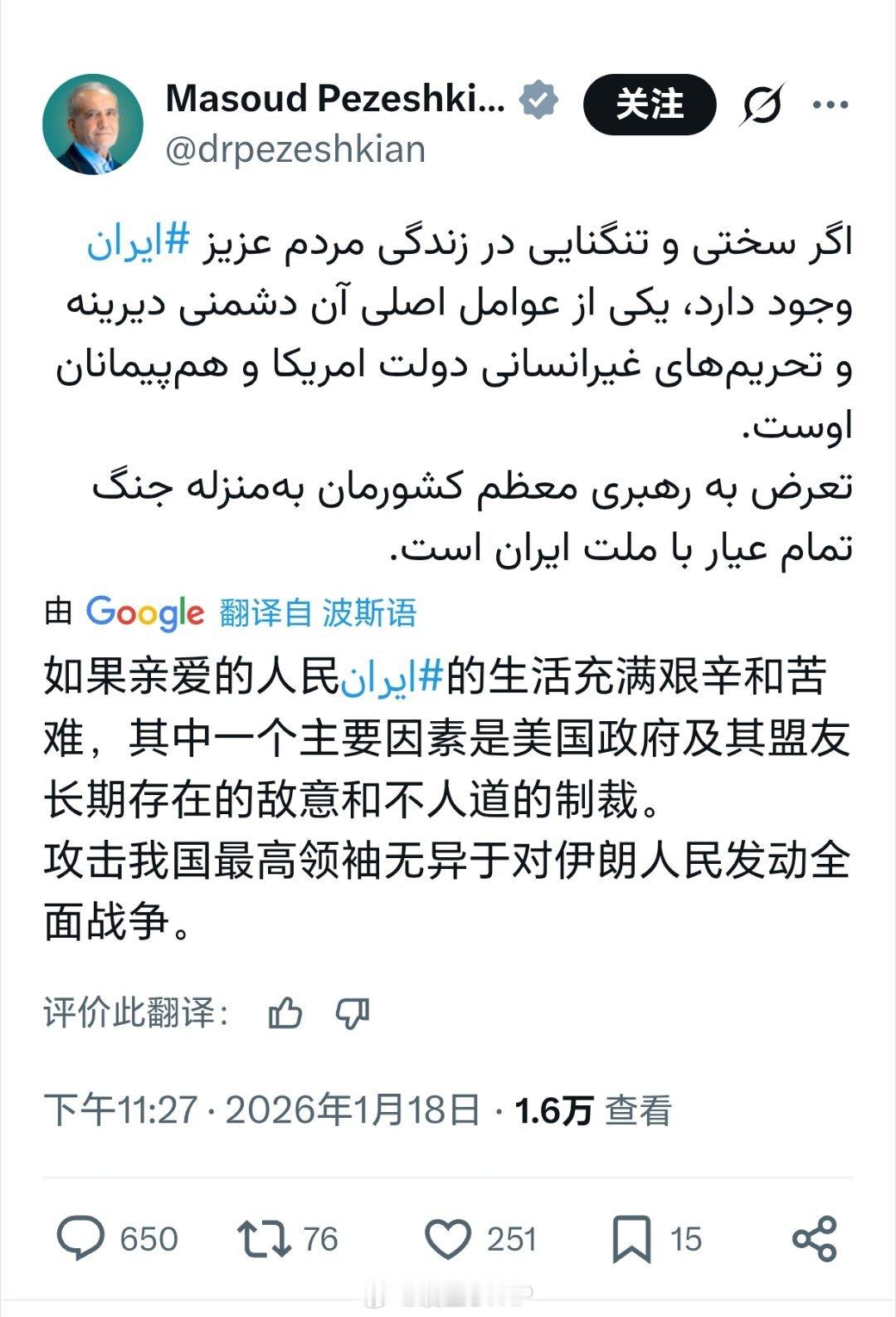 伊朗总统称攻击最高领袖致全面战争伊朗总统佩泽希齐扬新年发表第一贴:如果亲爱的伊朗人民的生活充满艰辛和苦难,其中一个主要因素是美国政府及其盟友长期存在的敌意和不人道的制裁。 攻击我国最高领袖无异于对伊朗人民发动全面战争。此前,特朗普在接受Politico采访时曾称,“伊朗是时候寻找新的领导人了” 。