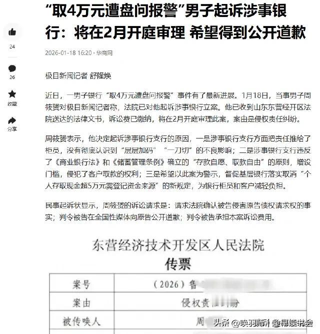 山东律师周先生取款4万元遭银行过度盘问并报警一事,引发对金融机构权力边界的讨论。