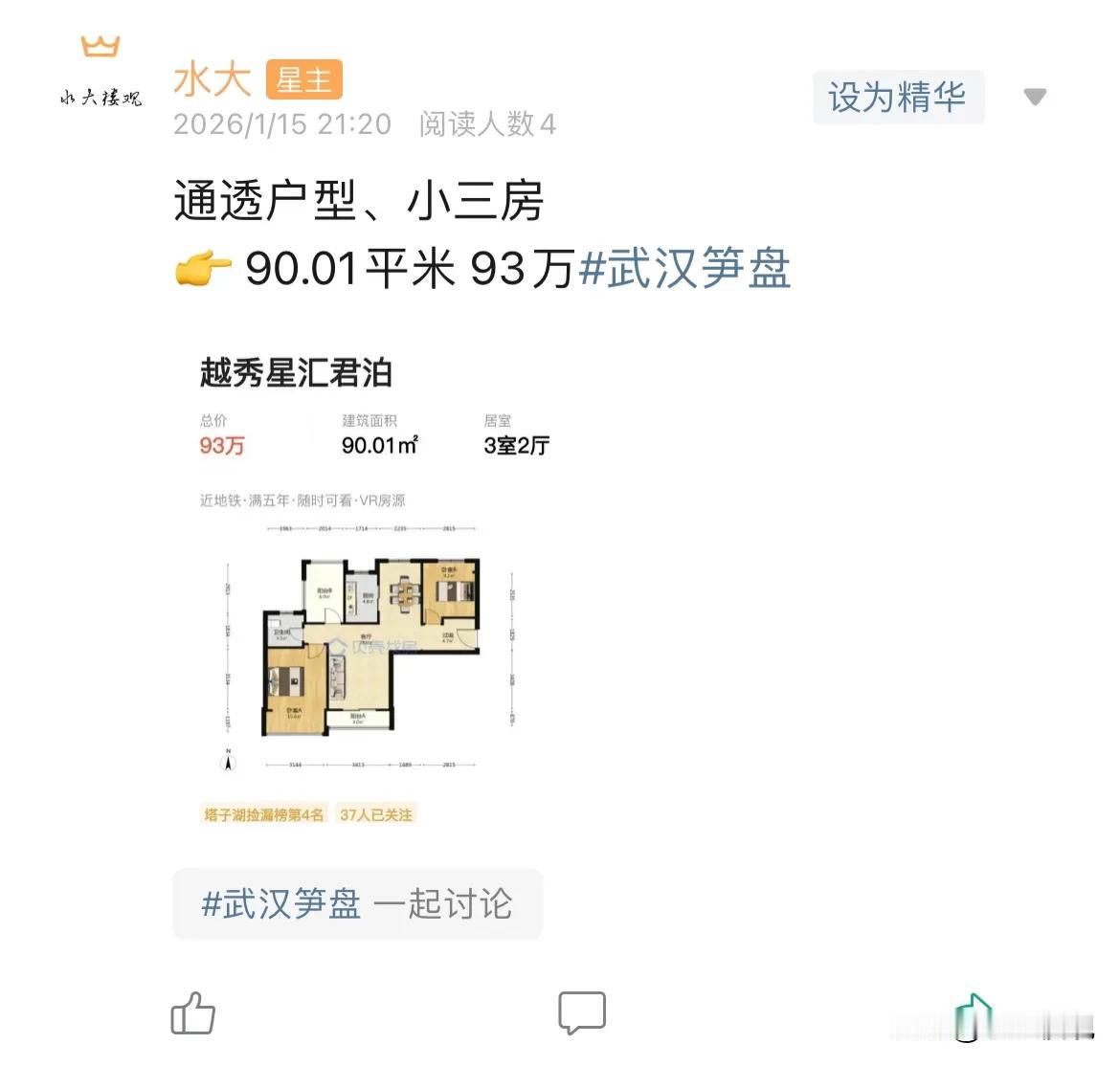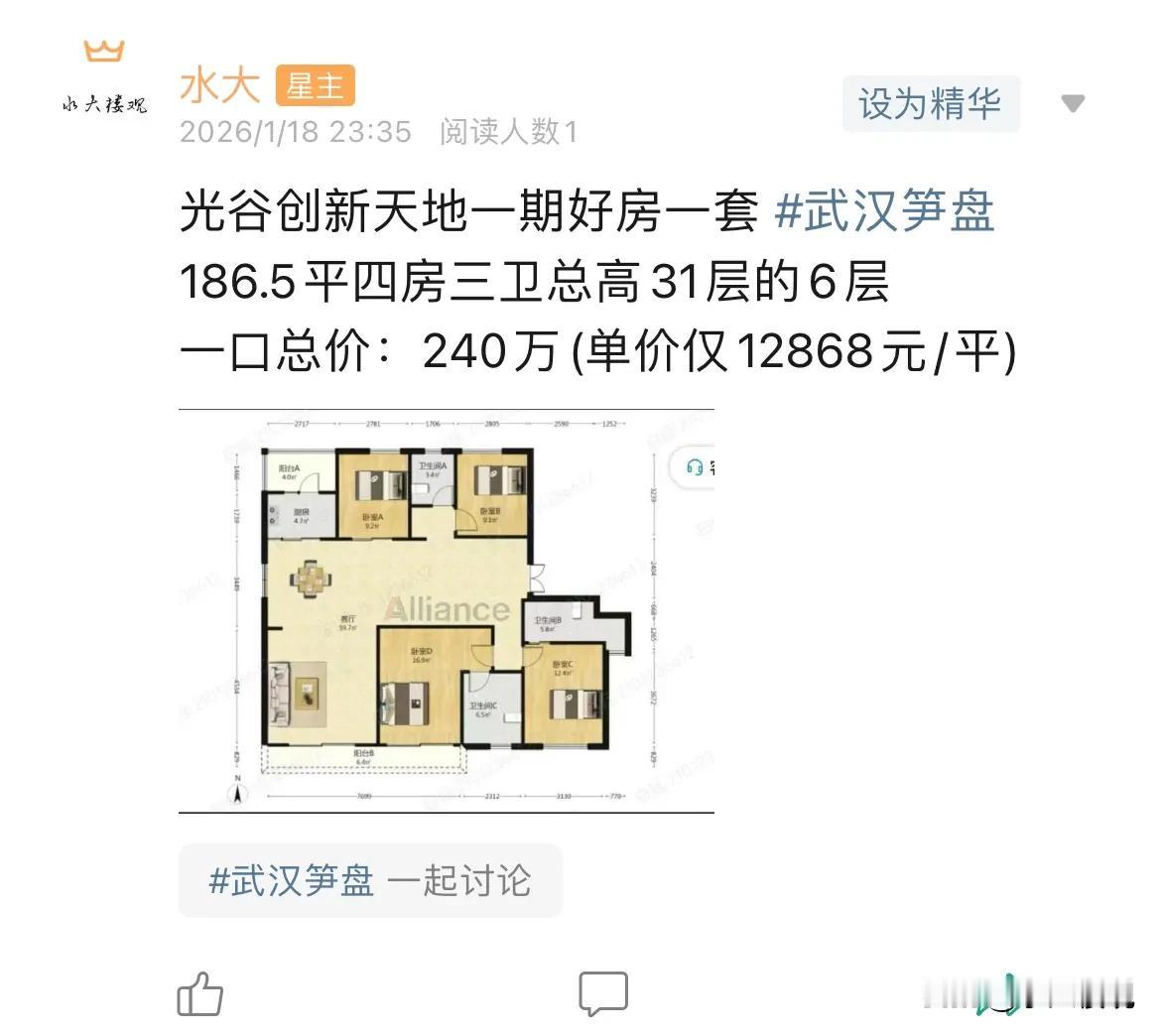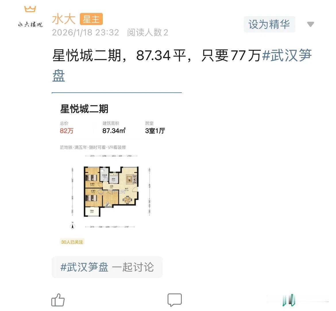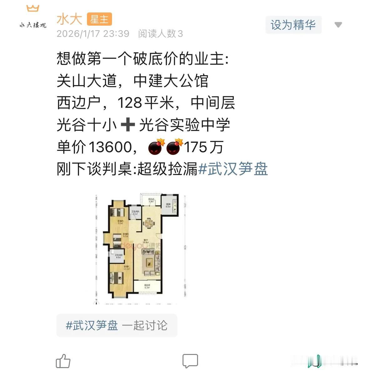 今日美居 1.金地天悦,2015年,这个楼盘剩下5楼以下的,委托给当时的吉家卖,博主还记得,当时的价格是1.35,当时博主觉得挺便宜的,没想到会有今天的价格。 2.两房做通透的在武汉很少,但是就是有楼盘能做到,比如越秀,比如大华,这样的两房,其实就比较受欢迎。 3.原来的关山大道扛把子,神神秘秘捂着不开的大公馆,如今都到这个价格了,你说说,这是什么原因? 4.星悦城这个房子,当时博主还是陪着前女友一起去看的新房,当时竟然还觉得新房性价比不错,现在1万以下。 5.大华的洋房,别墅,都是南湖非常保值的,但是小房子就不行了,还有一期因为房龄原因,也不太行了。 6.创新天地一期,当年有多少人排队啊,有多少人遗憾买不到啊,半开放式小区,物业也换了,入住率反而越来越低,这恐怕是整个光谷,最令人遗憾的小区了,你猜猜原因是什么。 房价已经止跌回稳,各位不要错判形势,该买就要买,中国经济前景无限,中国房地产目前健康水平空前,具有极大的购买价值,有需要的,不要犹豫,马上买!
