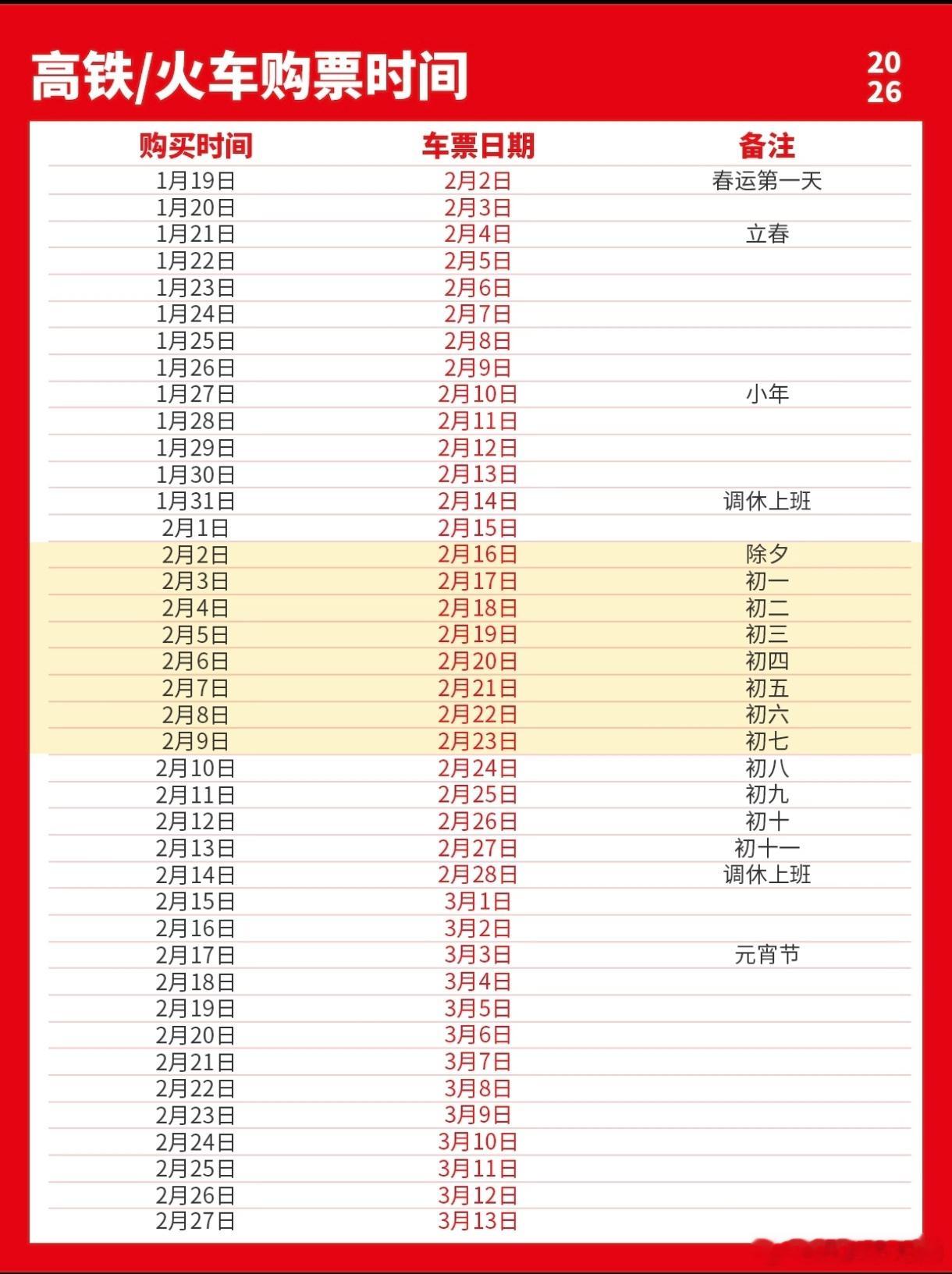 🗓️关键抢票时间点整理:✅ 春运首日(2.2)车票 → 1.19起售✅ 腊月二十七(2.14)车票 → 1.31起售✅ 腊月二十八(2.15)车票 → 2.1起售✅ 除夕(2.16)车票 → 2.2起售🌟✅ 正月初七(2.23)车票 → 2.9起售✅ 正月初八(2.24)车票 → 2.10起售✅ 元宵节(3.3)车票 → 2.18起售今年春运购票4个关键时间点