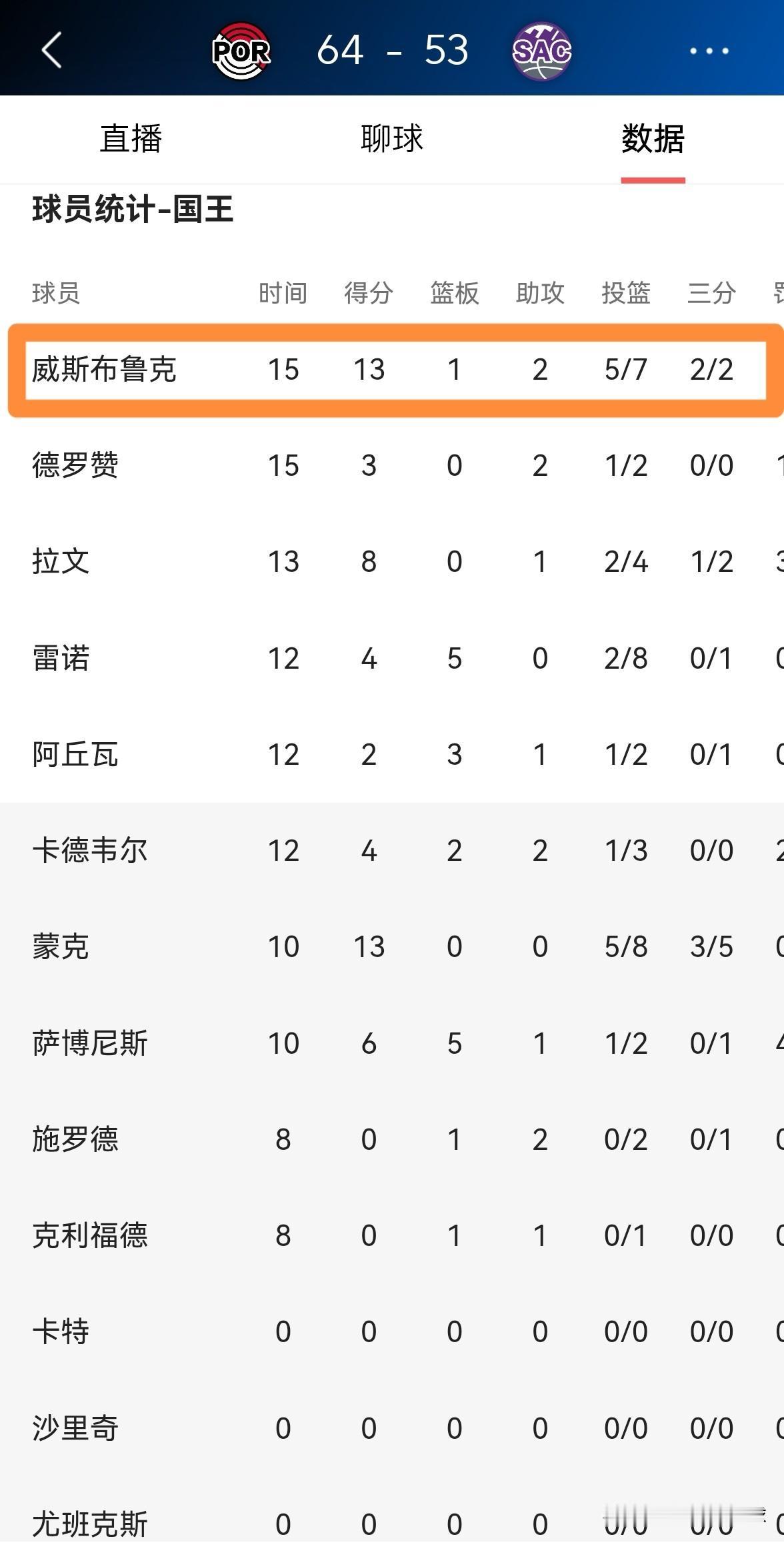 国王老将威斯布鲁克又给人送惊喜了!在今天国王主场迎战开拓者的比赛中,目前双方的上半场比赛已经结束,虽然目前国王以53:64落后于对手,但是威少的表现真是太让人惊喜了。 在前两节比赛中,威少首发出战15分钟,投篮7中5,其中三分球2中2、罚球1中1非常高效的砍下13分,还有1篮板2助攻,只出现了1次失误。 在我看来,只要威少能够在比赛中命中三分球并且减少失误,那就是惊喜连连了。