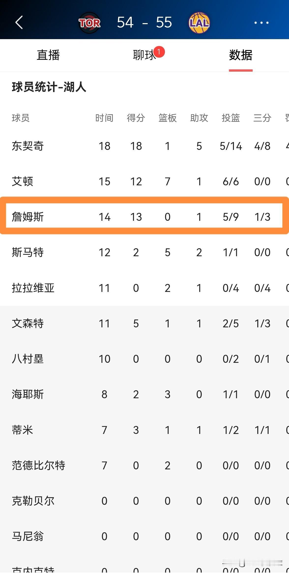 湖人超级巨星詹姆斯真是太反常了!在今天湖人主场迎战猛龙的比赛中,目前双方半场战罢,湖人以55:54领先对手。在前两节比赛中,詹姆斯首发出战14分钟,投篮9中5,其中三分球3中1、罚球2中2得到13分,他的场上正负值为+5。让人感到非常意外的是,在上半场比赛中詹姆斯竟然0篮板,这样的情况真是太反常了,要知道詹姆斯本赛季场均可以抢到6个篮板。 究竟是谁抢走了詹姆斯的篮板球???