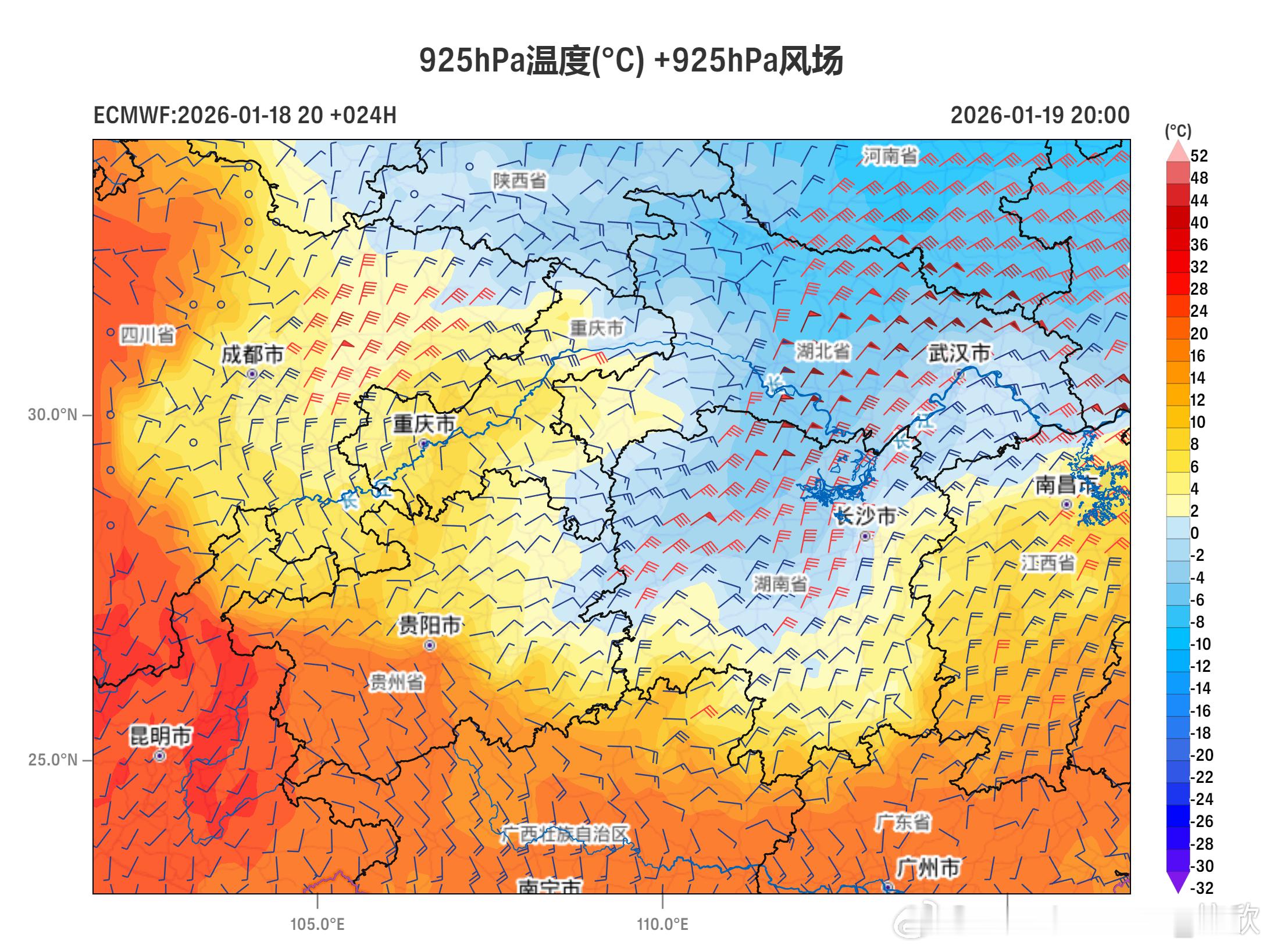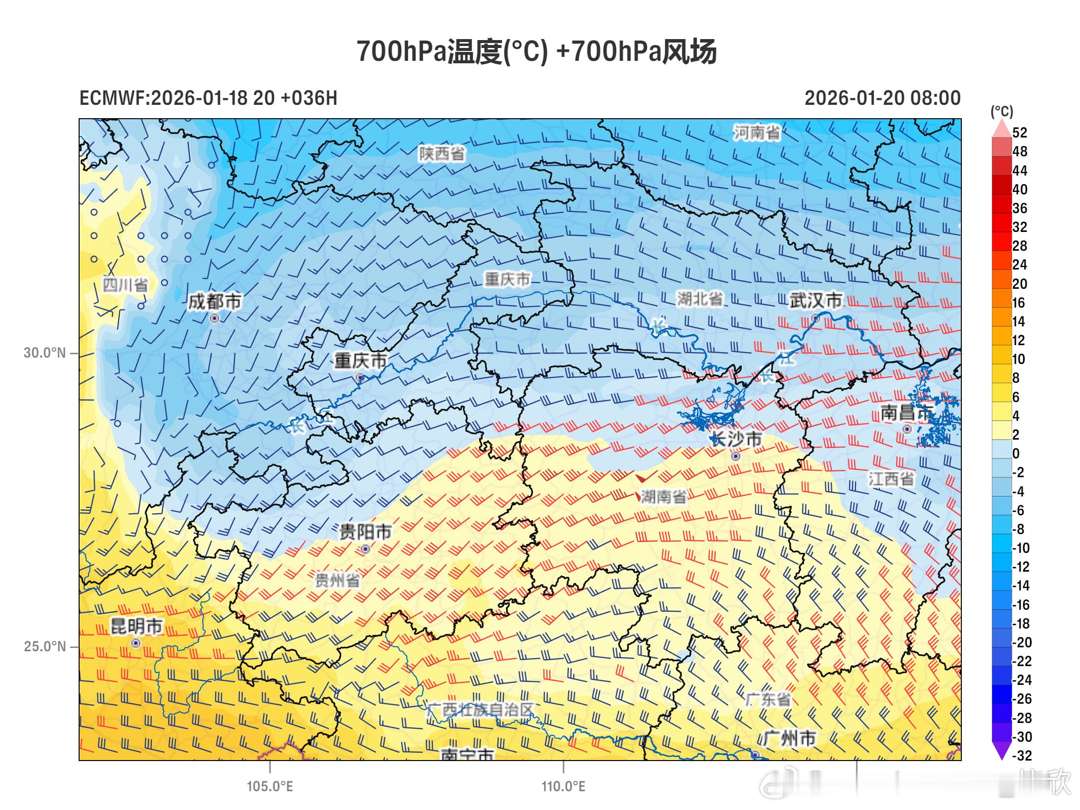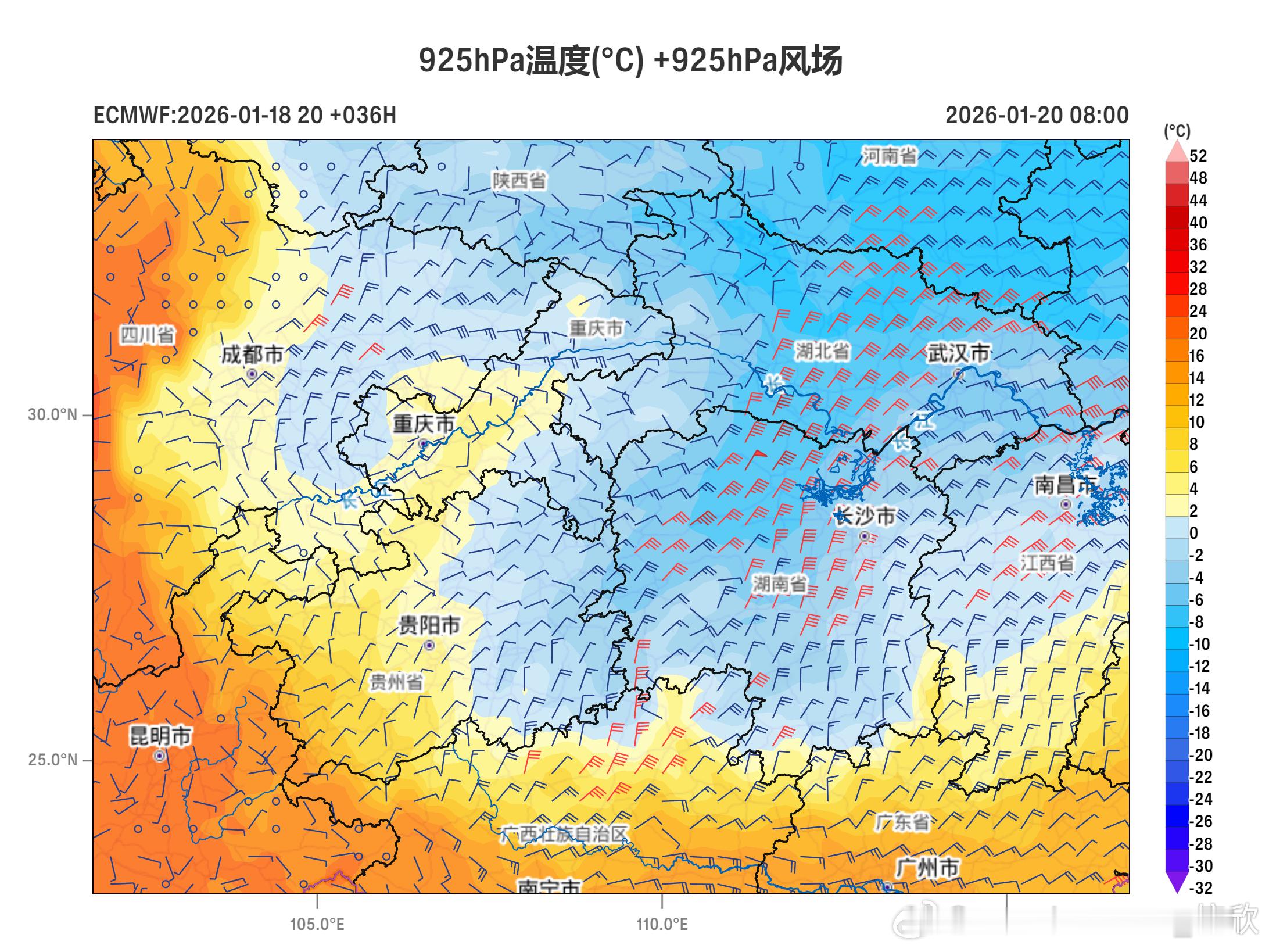 【暴雪和冰冻双预警】昨天到今晨,雨雪天气继续发展增多。山东中南部出现中到大雪。今天强降雪和冻雨都会增多。中央气象台今晨发布暴雪和冰冻的双预警:总体上,今天的强降雪以河南湖北为中心,今天的冻雨以贵州湖南为中心。冻雨在强降雪区南侧,更靠近冷锋附近,存在低空逆温的区域。预计1月19日08时至1月20日08时,陕西南部、山西南部、河南中南部、安徽中北部、江苏西部、湖北西部和北部、湖南北部、重庆北部等地部分地区有大雪,其中,陕西南部、河南南部、安徽西部、湖北北部和西部等地部分地区有暴雪(10~18毫米)。上述部分地区新增积雪深度4~8厘米,局地可达12厘米以上。预计,1月19日08时至20日08时,河南东南部、安徽西南部、湖北中南部和东北部、湖南中北部、江西西北部、四川盆地东北部、重庆东南部、贵州东部等地的部分地区有冻雨或冰粒,上述大部地区冻雨量1~3毫米,湖南西部、贵州东部等地部分地区可达4~6毫米、局地8毫米以上。图5-6为今晚20时,低空温度和风场对比,925百帕为大约800米低空,东北风对应冷空气向湖南贵州推进,蓝色为低于0℃区域。而700百帕大约3000米高度,有西南暖湿气流推进上来,气温高于0℃。这样就在贵州湖南出现了下冷上暖的逆温结构。图7-8为20日08时,逆温区范围更大。