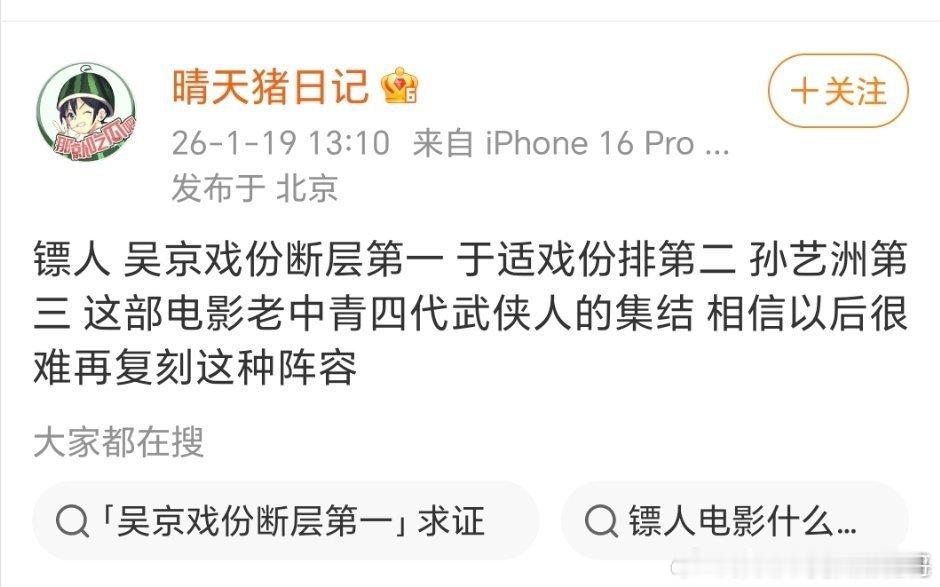 电影镖人吴京戏份断层第一,于适第二,孙艺洲第三