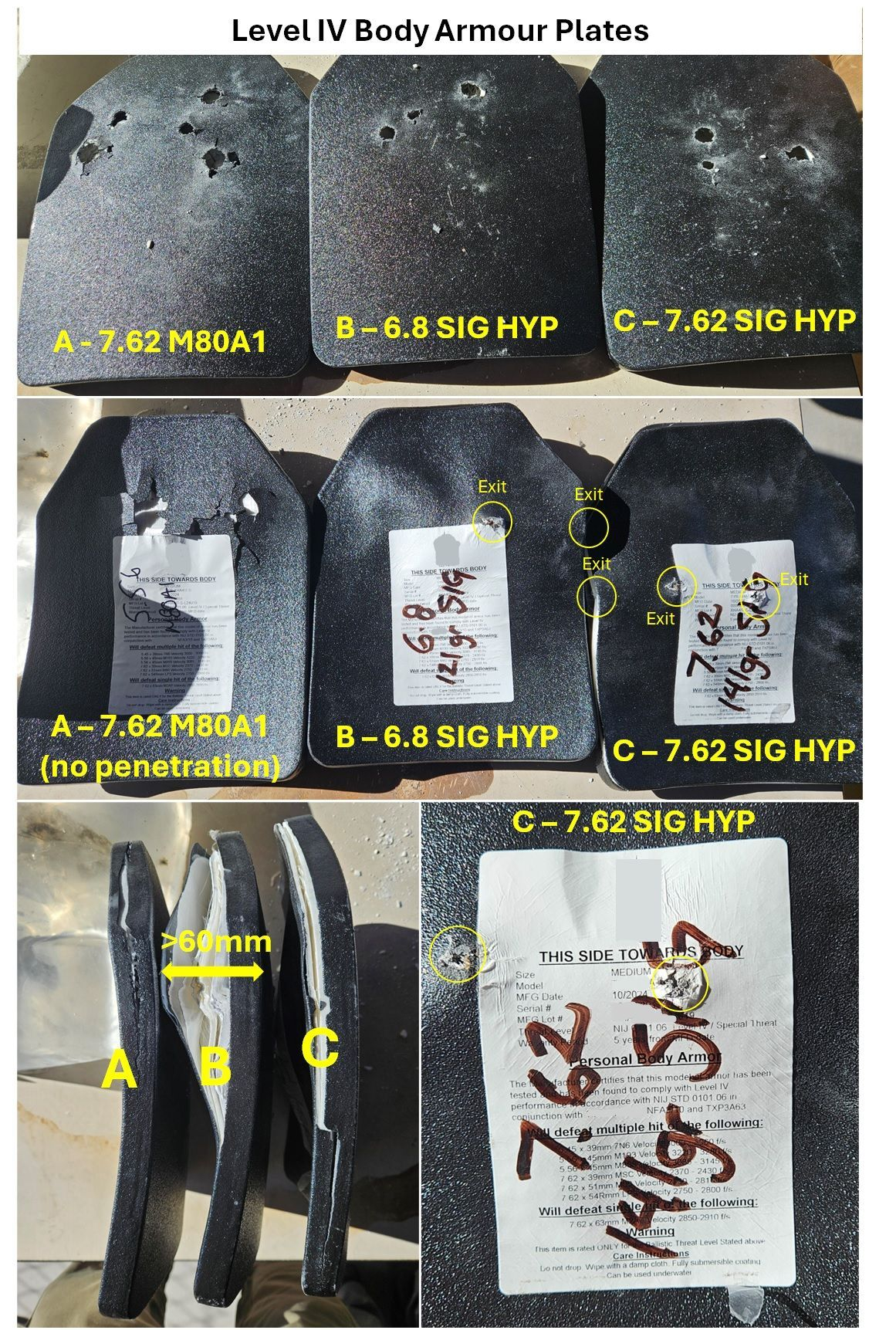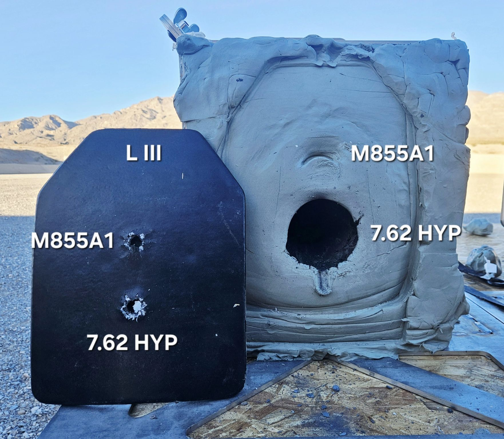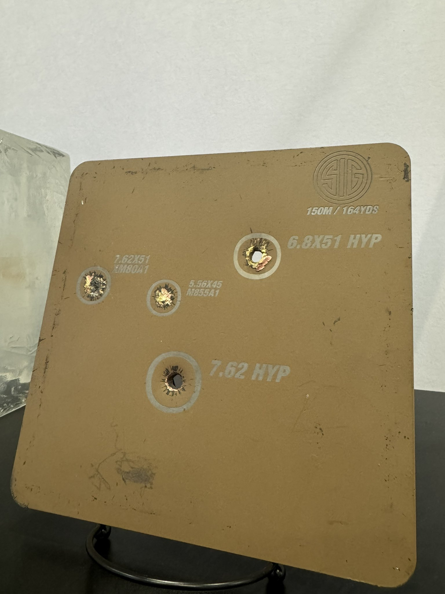 采用混合弹壳(HYP)设计的7.62 毫米子弹(带有普通钢芯穿甲弹头)同美军现役制式5.56毫米子弹(M855A1)的侵彻能力对比,射击了三级和四级防弹插板,HYP子弹采用机械结合技术,将钢制弹壳底部与黄铜弹壳主体结合到一起,以满足承受高膛压峰值的需要,HYP子弹平均比黄铜弹壳子弹轻 30%,膛压高20-25%,终点能量增加 28%,MD三等人的M7步枪/M250机枪发射的6.8毫米子弹就采用了混合弹壳(HYP)。每天认识一件兵器烽火问鼎计划