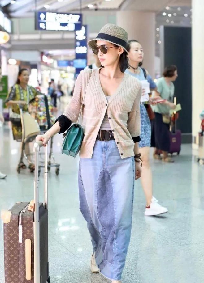 黄圣依机场私服好会穿! 浅卡其针织开衫+紧身背心+牛仔半裙,松弛又高级,复古绿包包一搭,减龄时髦感直接拉满~ 黄圣依