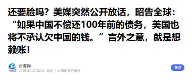 还要脸吗?美媒公开放话,昭告全球,如果中国不偿还 100 年前的债务,美国也将不承认欠中国的钱。 这话一出口,全球不少人都愣住了——堂堂美国主流媒体,竟然能把这么不要脸的逻辑直接喊出来:你不认我百年前的旧账,我就直接不认现在欠你的钱。明摆着就是想赖账,还想赖得理直气壮。 说白了,美国现在手里捏着一万多亿中国买的美债,这是实打实的借钱关系,是拿真金白银换来的债权,可他们偏偏要把这事和1901年那笔庚子赔款硬扯到一起,企图用一百多年前的强盗账单,来抵消今天的欠条,操作不可谓强盗。 现在美国国债的信用,是建立在“美国从不赖账”这个金字招牌上的,这些年他们为了撑经济,印钞机开足马力搞量化宽松,美元购买力一路往下掉,实际上就是在用通胀慢慢割全球债权人的韭菜。中国外汇储备里那堆美债,早就被这种软刀子割得账面亏了不少。 有些美国政客还嫌不够狠,公开嚷嚷可以搞“技术性违约”,晚还几天利息也没啥,结果惠誉评级直接警告:再这么作,美国国债就得降成垃圾级。李稻葵那句“别玩火”不是随便说的,真把中国这块大债主逼急了,全球金融市场能直接炸锅。 就在这种背景下,美媒甩出了这张“百年老账”牌,他们想把当年八国联军逼出来的庚子赔款,说成是一笔“正当债务”,然后拿它来当挡箭牌。 那笔赔款到底什么来头?1901年《辛丑条约》,列强按当时中国4.5亿人口,一人一两白银算账,本息加起来要9.8亿两。 清政府被打得抬不起头,只能把海关、盐税全押出去,各省再疯狂摊派,四川一年70万两,广东100万两,这些钱最后还不是从老百姓骨头里榨出来的?家破人亡、卖儿卖女的惨剧到处都是。这不是借贷,这是明晃晃的战争抢劫。 美国当年分了2400多万美元赔款,但他们自己统计的实际损失加军费才1360万,多出来的1000多万就是纯纯趁火打劫。 后来美国退还一部分钱,拿去办了清华学堂,听着挺好心,但当年伊利诺伊大学校长詹姆士给总统的信里写得明明白白:用这笔钱教育中国年轻人,将来就能在精神和商业上控制这个国家。说穿了,就是用抢来的钱培养未来的代理人。 至于中国后来不继续付赔款,那是因为打起了太平洋战争,对日宣战之后,谁还给侵略者送钱?这是战争状态下的正常操作。结果到了美媒嘴里,居然成了中国“赖账”的铁证,颠倒黑白能颠到这个地步,也真算开了眼。 现在他们把枪口下逼出来的血债,和正常市场里买的国债相提并论,逻辑已经烂到根上了,一个是强盗把刀架脖子上逼你打欠条,一个是双方自愿、基于信用的借贷,这俩东西能相提并论?脸都不要了。 说到底,美国现在翻这笔旧账,不过是债务越滚越大,自己心里发虚,又不敢直接撕破脸宣布违约——因为真撕了,美元霸权就得当场暴毙。 印度央行官员直接说这是“可怕的馊主意”,欧盟也看不下去,美国自己学者都警告说后果堪比金融核弹。 美媒这波操作,表面气势汹汹,实际上色厉内荏,它既不敢承认当年侵略的合法性,又不敢真的对中国违约,只能靠甩历史屎盆子来制造舆论烟雾弹。可惜现在不是义和团那会儿了,中国早就不是随便任人拿枪指着脑袋逼债的那个国家。 用强盗当年的抢劫记录,来给今天的赖账找理由,这种玩法只会让全世界更清楚地看见:美国的信用,已经开始自己往下掉渣了。