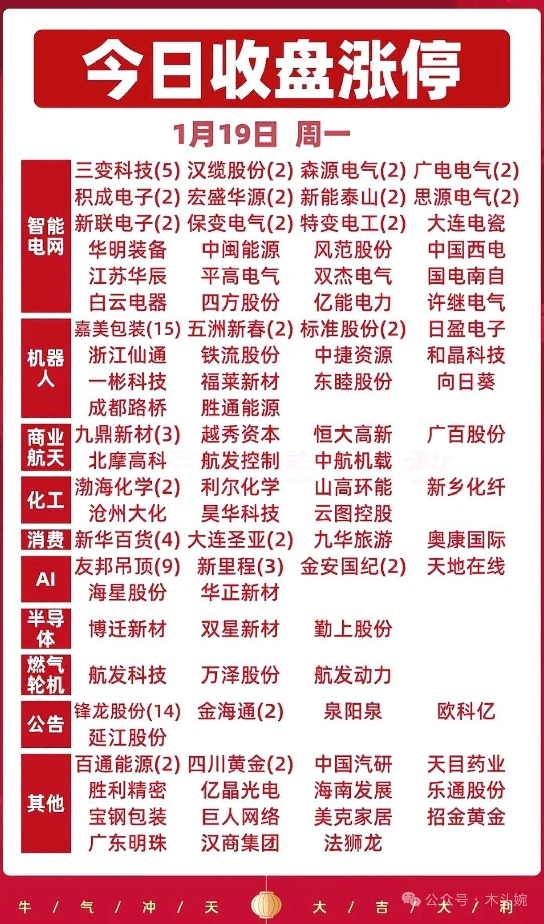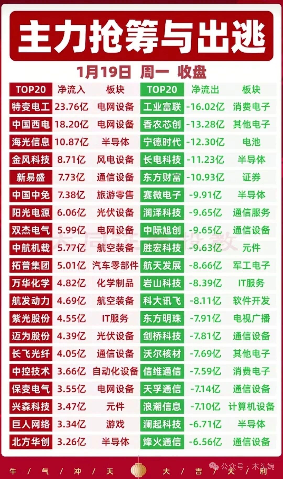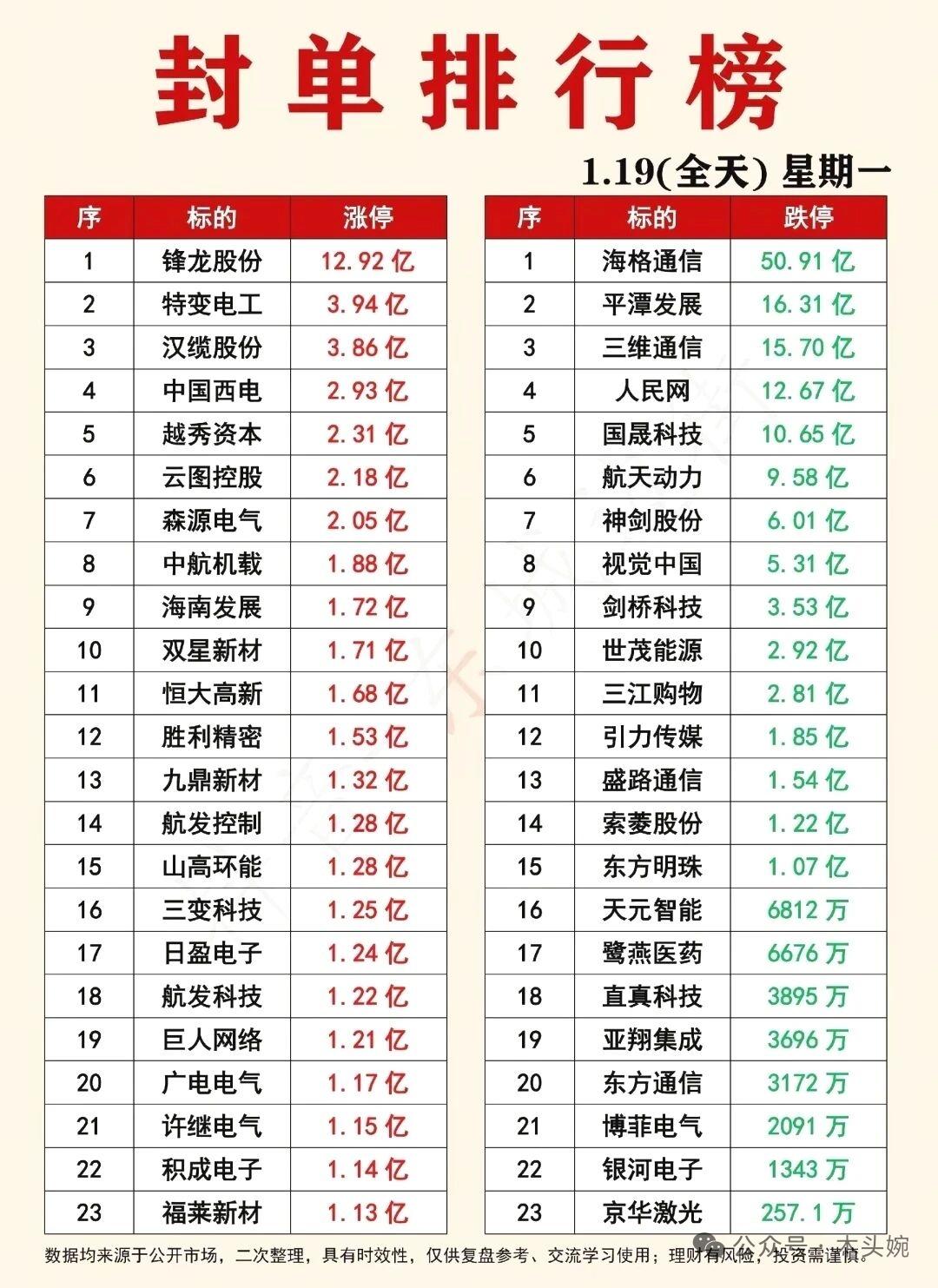 1月19日复盘资料:主力资金动向+游资龙虎榜+板块高度榜等等。 📊1月19日游资动向新鲜出炉!佛山系豪掷4.85亿杀入岩山科技,章盟主却反手砸盘5.78亿上演多空对决;中国西电成香饽饽,曲江池、中山东路联手扫货超3亿;海格通信、浙文互联则出现明显分歧。大佬们的买卖博弈激烈,看懂资金流向,才能跟上市场节奏。 📊1月19日主力资金全景图出炉!电网设备板块成吸金王,特变电工、中国西电合计净流入超41亿;半导体、风电设备等赛道也获大笔资金抢筹。另一边,消费电子、半导体板块遭主力大幅出逃,工业富联、香农芯创等龙头净流出均超13亿,宁德时代、东方财富也在抛售名单中。多空对决激烈,资金动向暗藏市场风口切换信号。 📊1.19封单排行榜新鲜出炉!锋龙股份以12.92亿涨停封单强势领跑,特变电工、汉缆股份等电网设备股紧随其后,成为资金抱团的热门方向。跌停板上,海格通信50.91亿封单格外刺眼,平潭发展、三维通信等也被巨额封单死死摁住,多空力量的极致对比,尽显今日市场的分化与博弈。 理财有风险入市需谨慎!资料取材网络仅供参考不能作为投资依据。