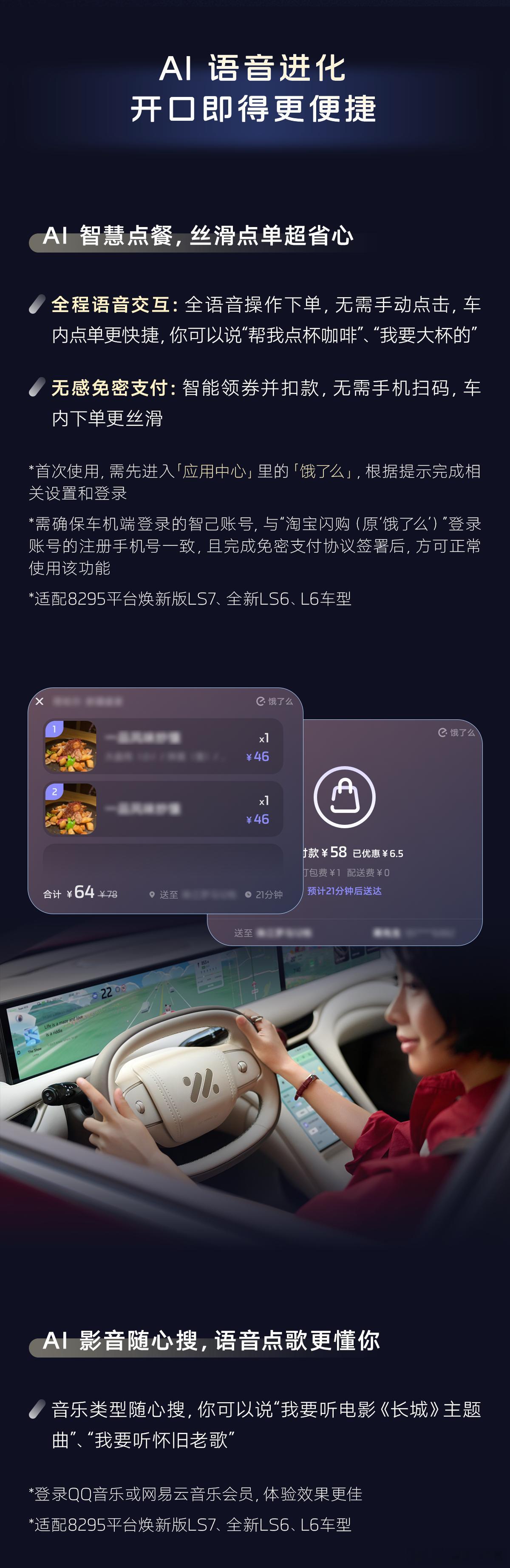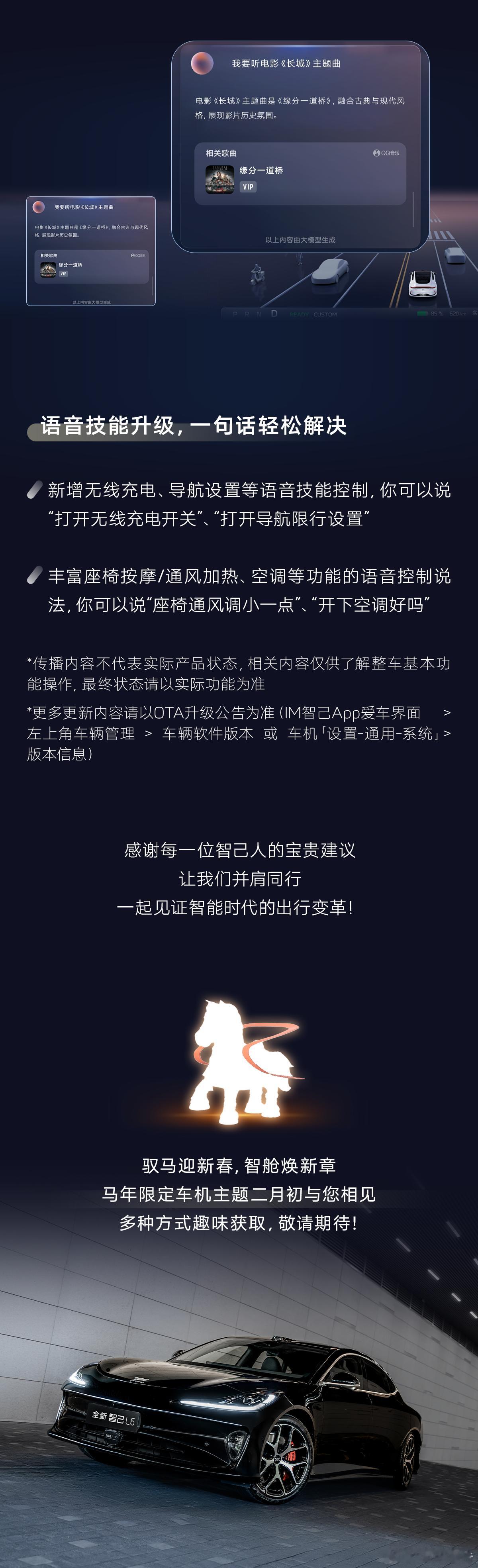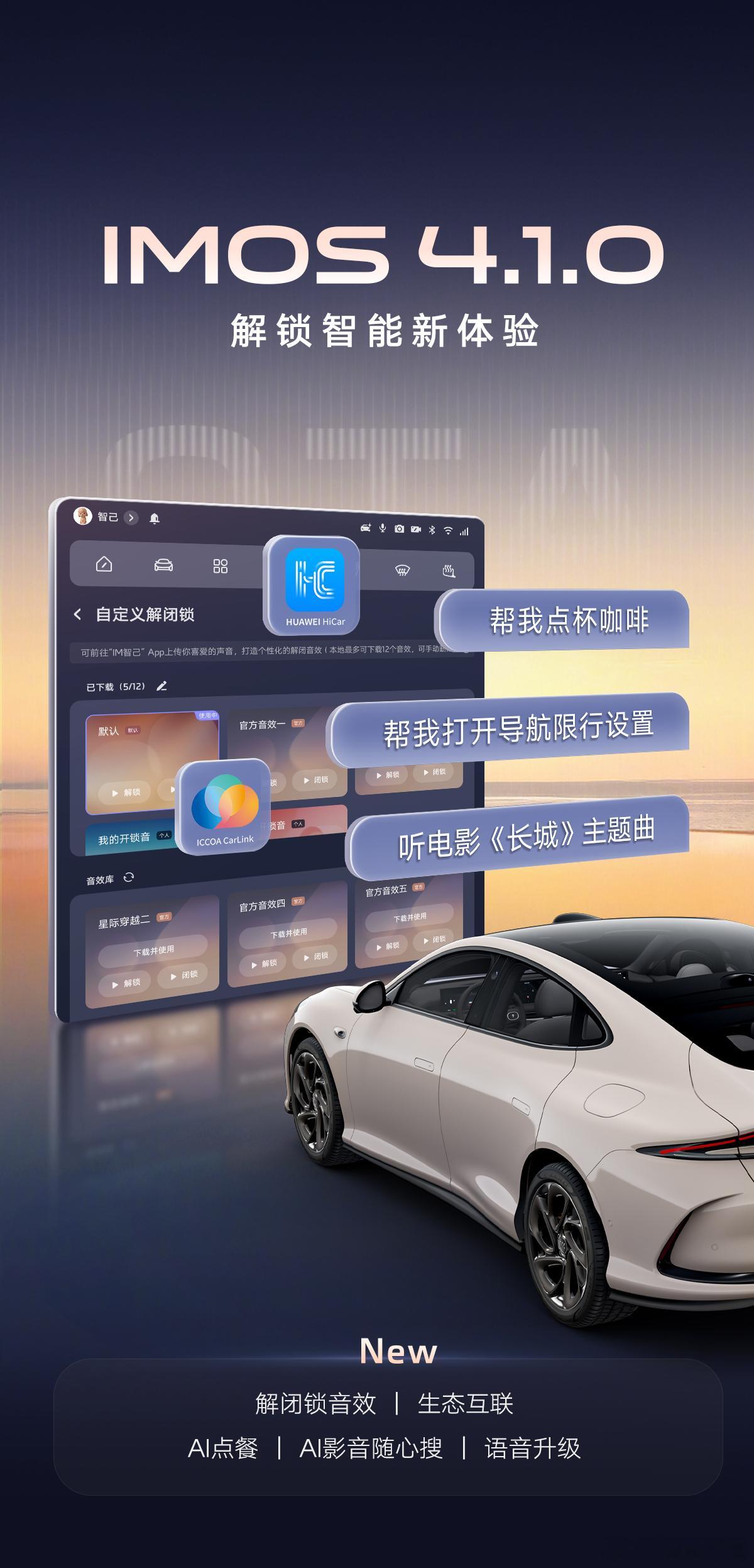 智己汽车 推送开年OTA升级IMOS4.1.0,新增自定义解闭锁音效、手车一键互联、AI点单搜影音功能,智舱体验全面焕新,邀用户点击探索。