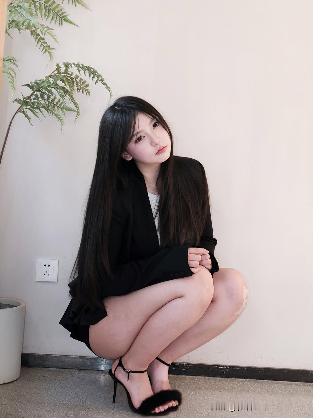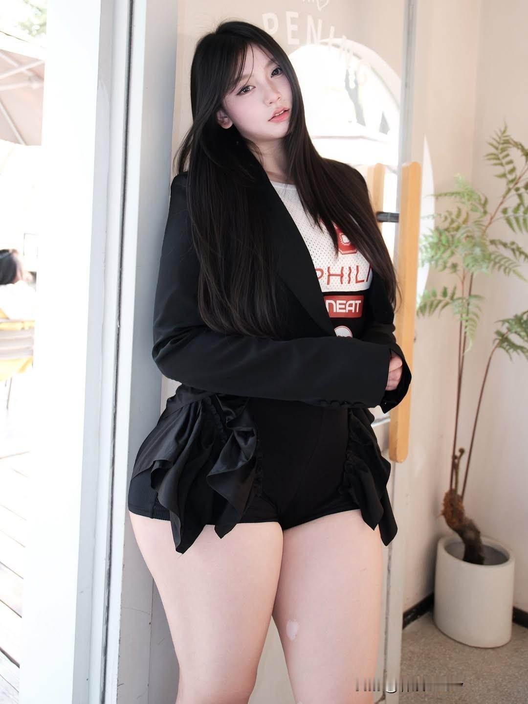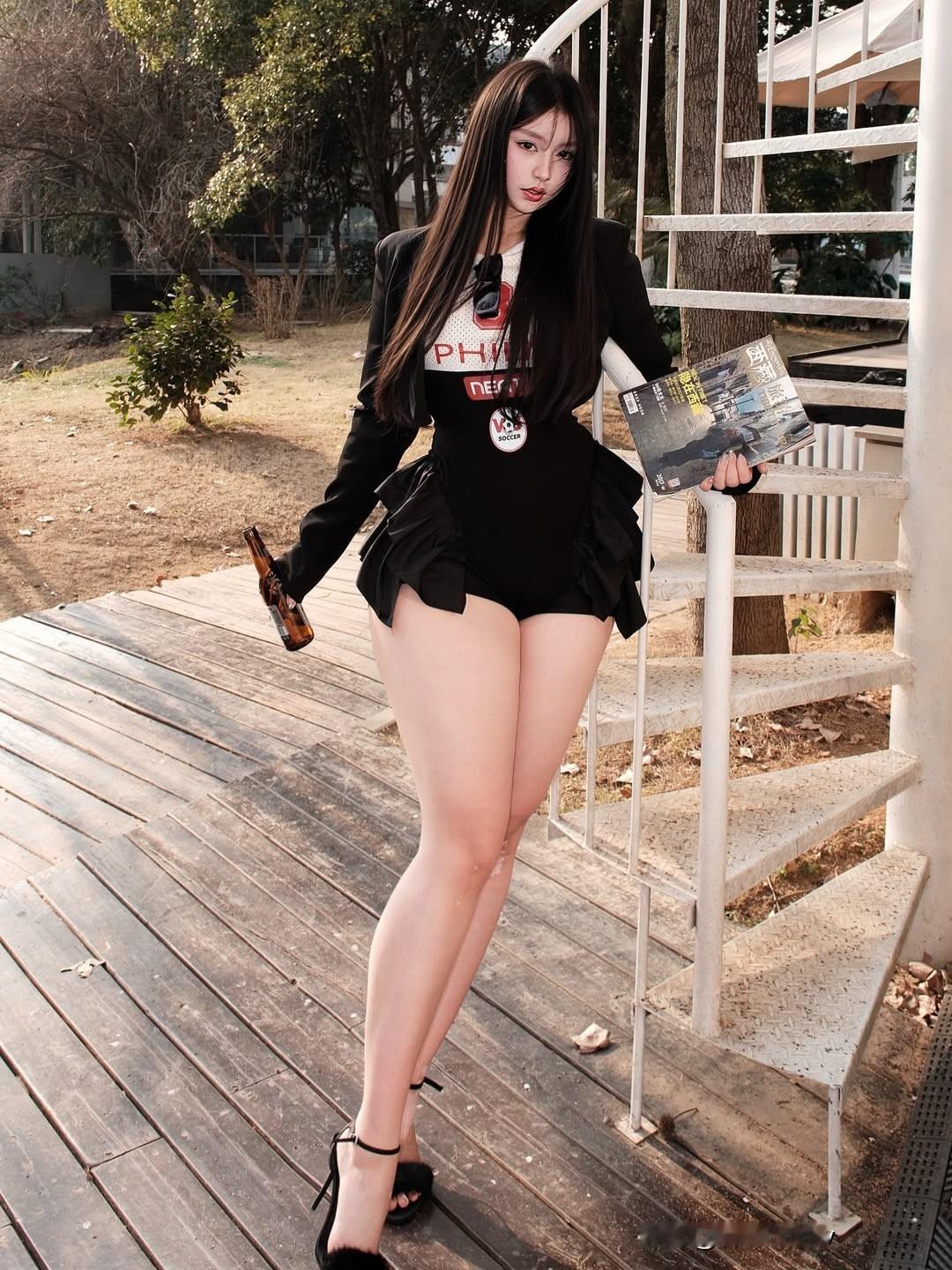 都市时尚少女,黑衣短裙,手持杂志,享受悠闲时光。微胖 漂亮小姐姐
