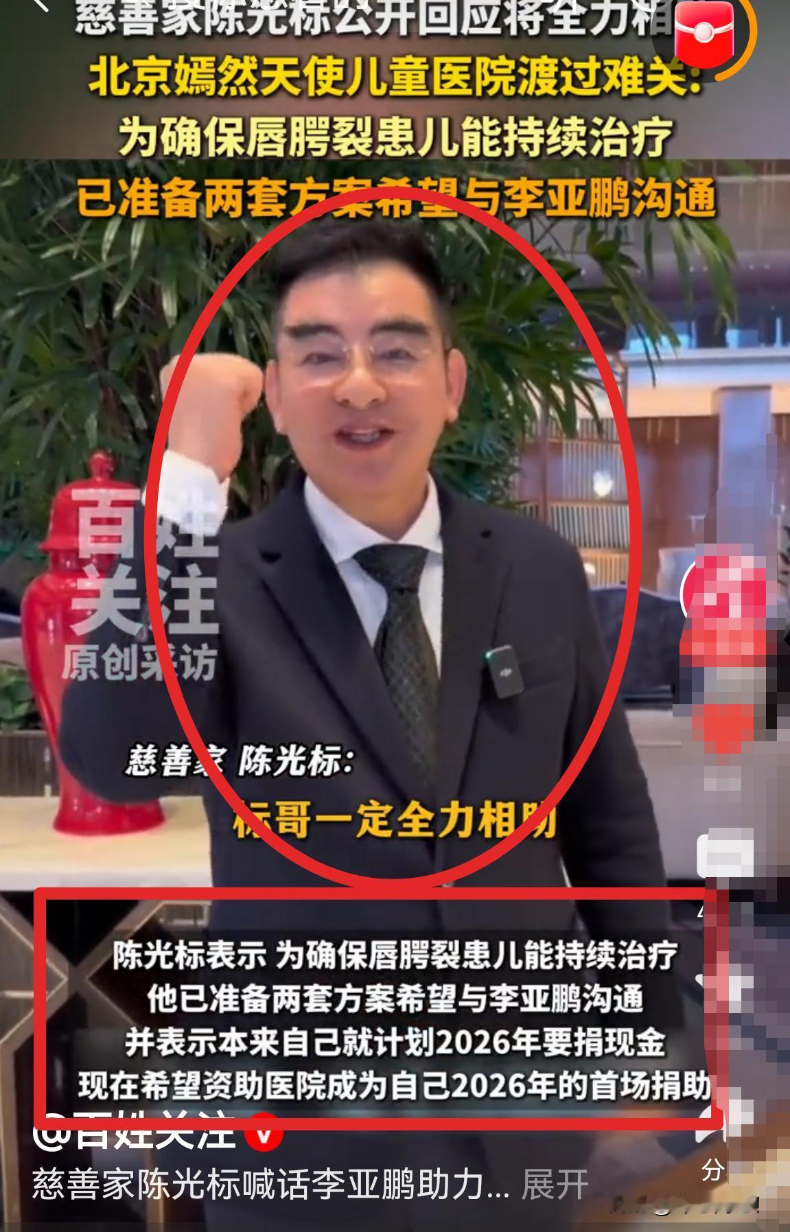 陈光标喊话李亚鹏,全力相助李亚鹏!两套方案:第一套,就是他捐助达社会捐款总额度的两倍。比如,社会捐款2000万,他就捐助4000万。第二套,全资收购嫣然天使医院,招聘有爱心的医生,让医院持续营运下去。 标哥做慈善,几十年不间断!相信他的为人!也相信李亚鹏在有爱的大众关爱之下,医院能走出困境,继续为唇腭裂患儿奉献爱和帮助!你说呢?欢迎评论。