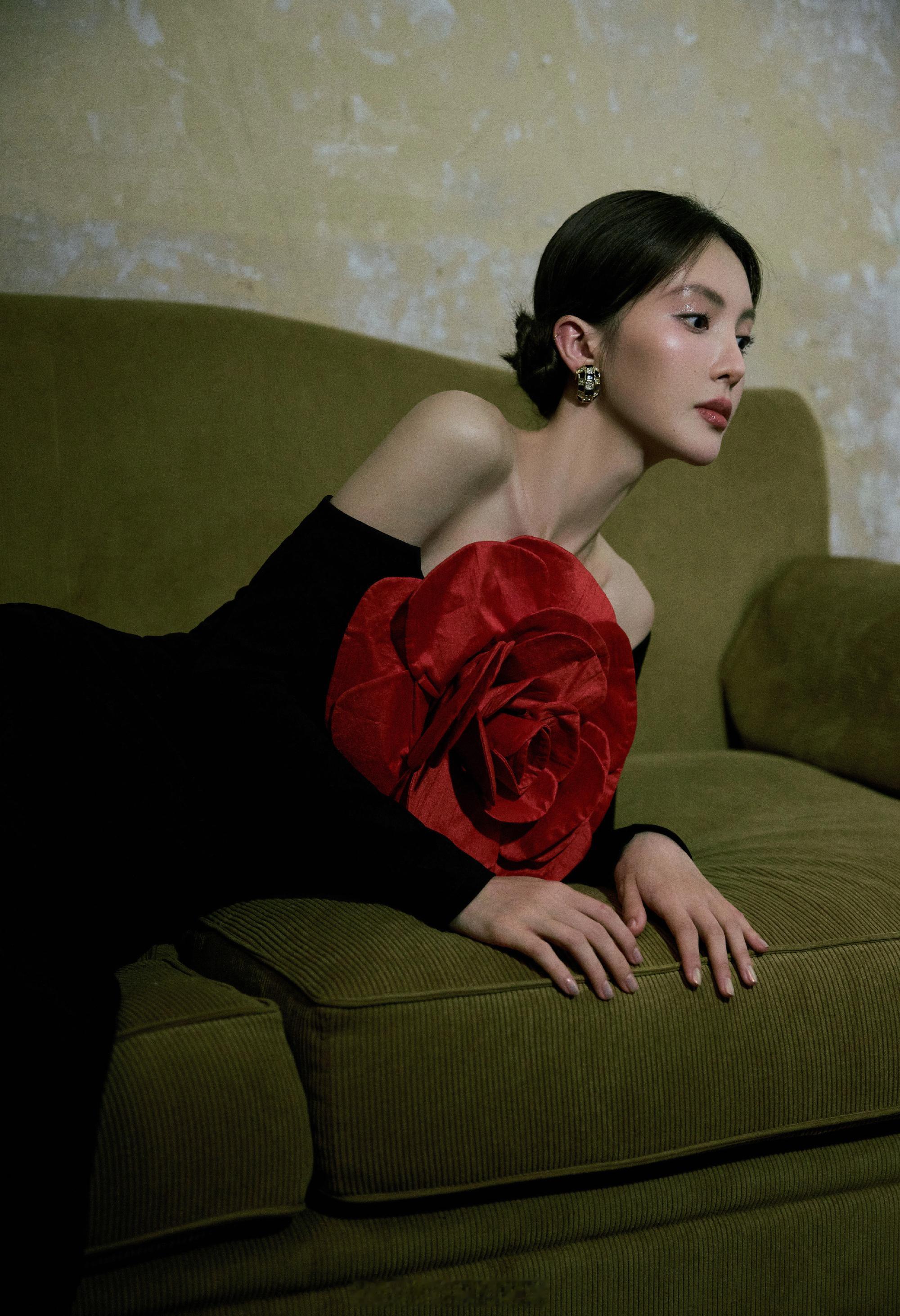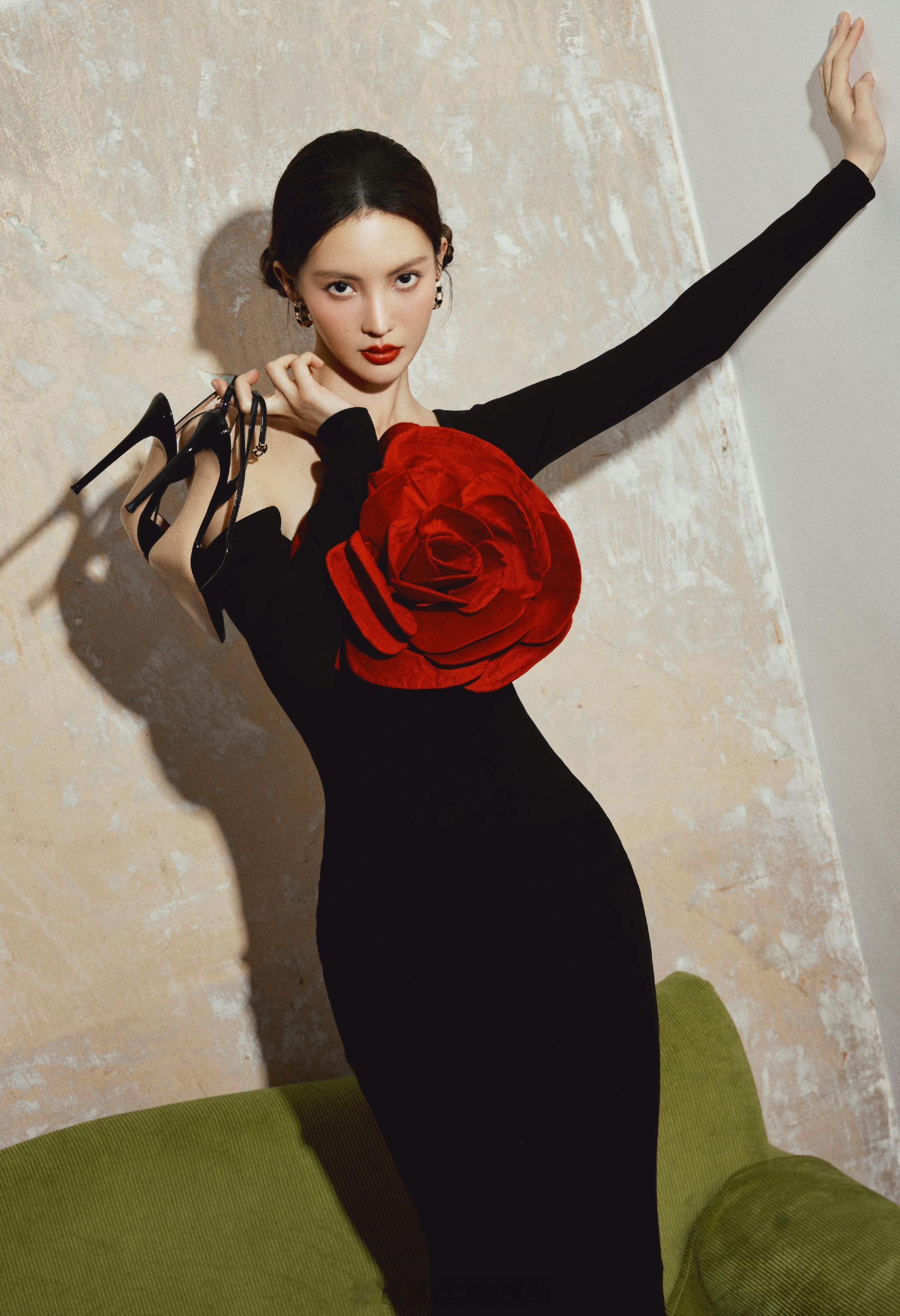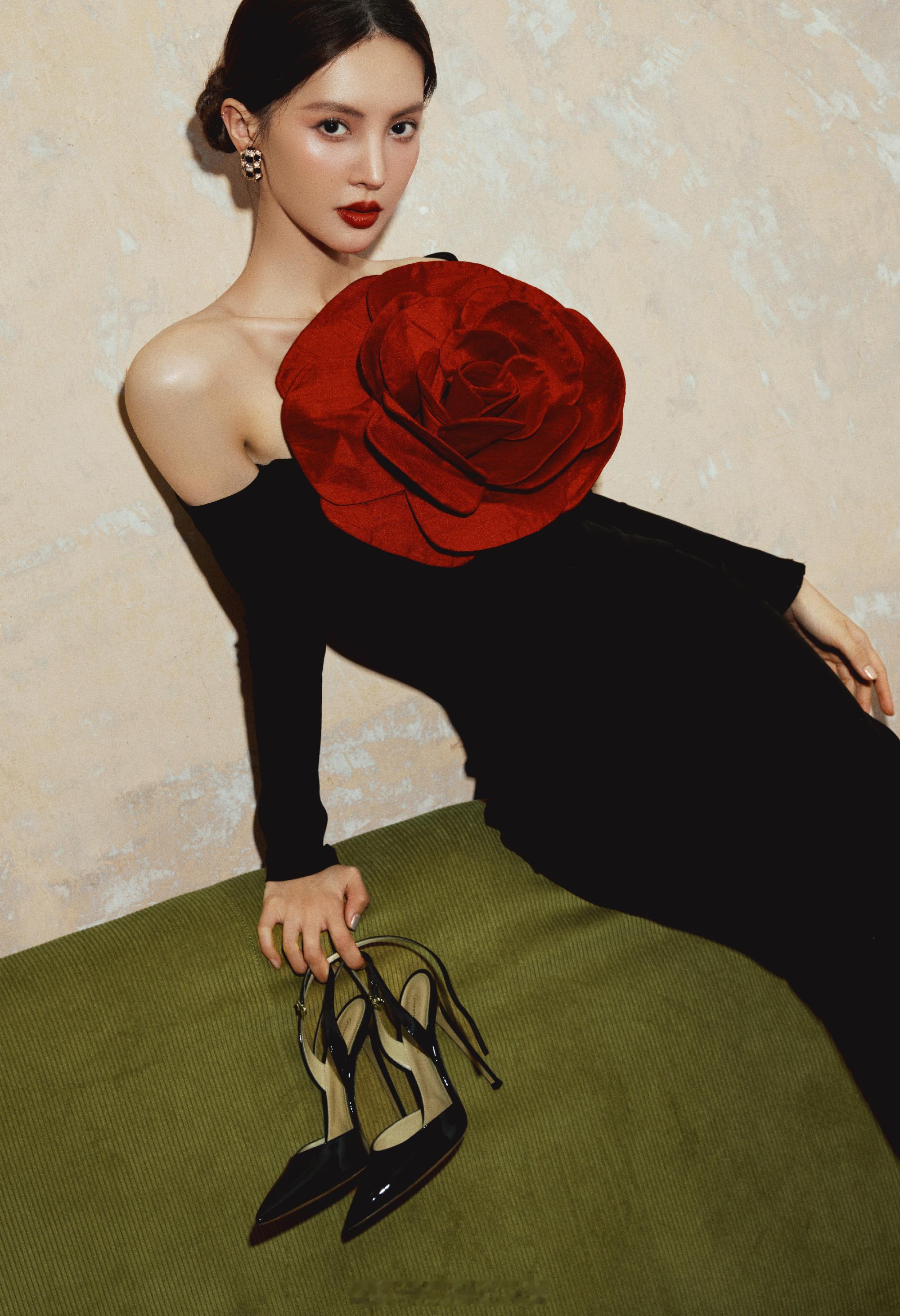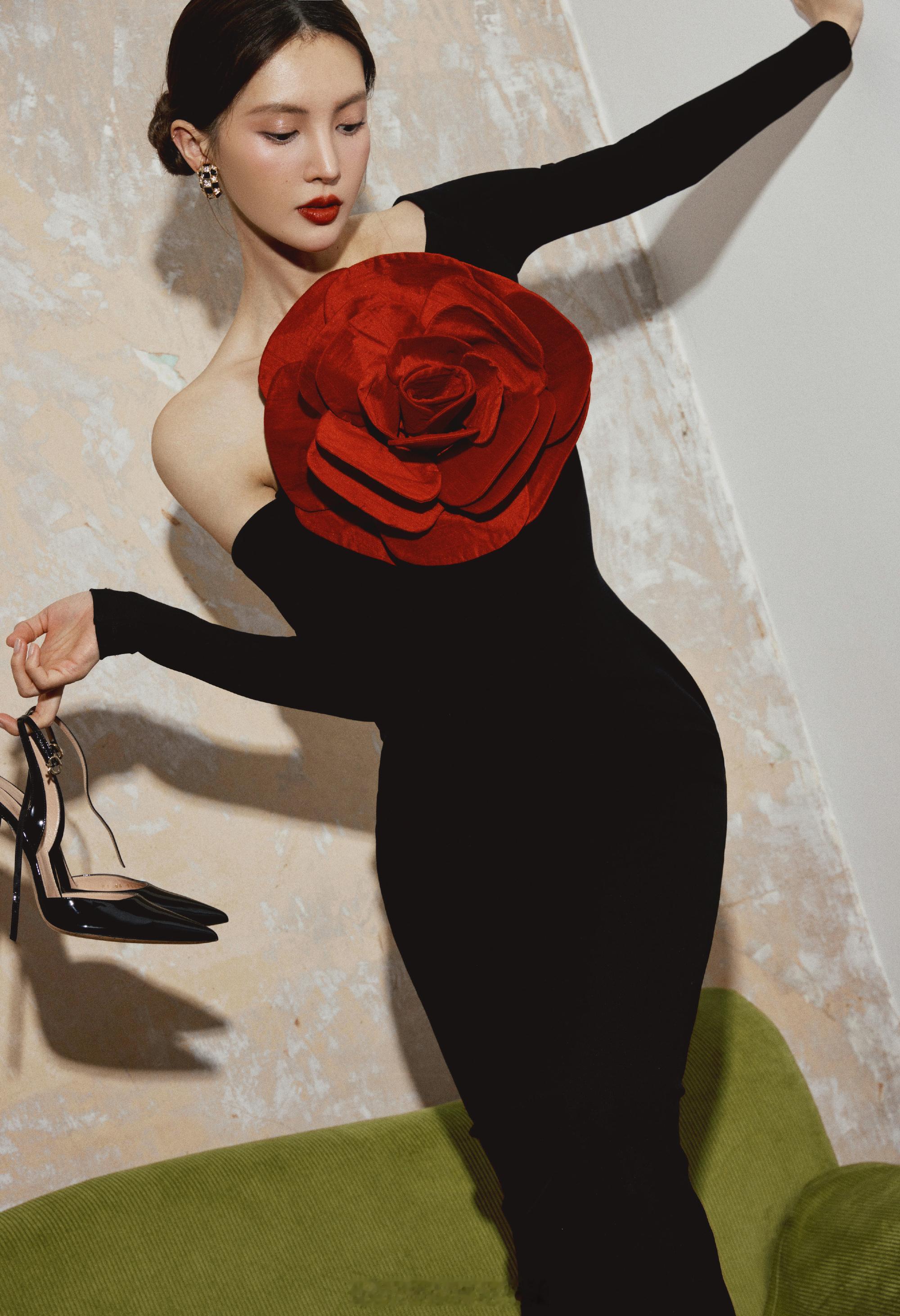 金晨黑色长裙胸前大红花朵