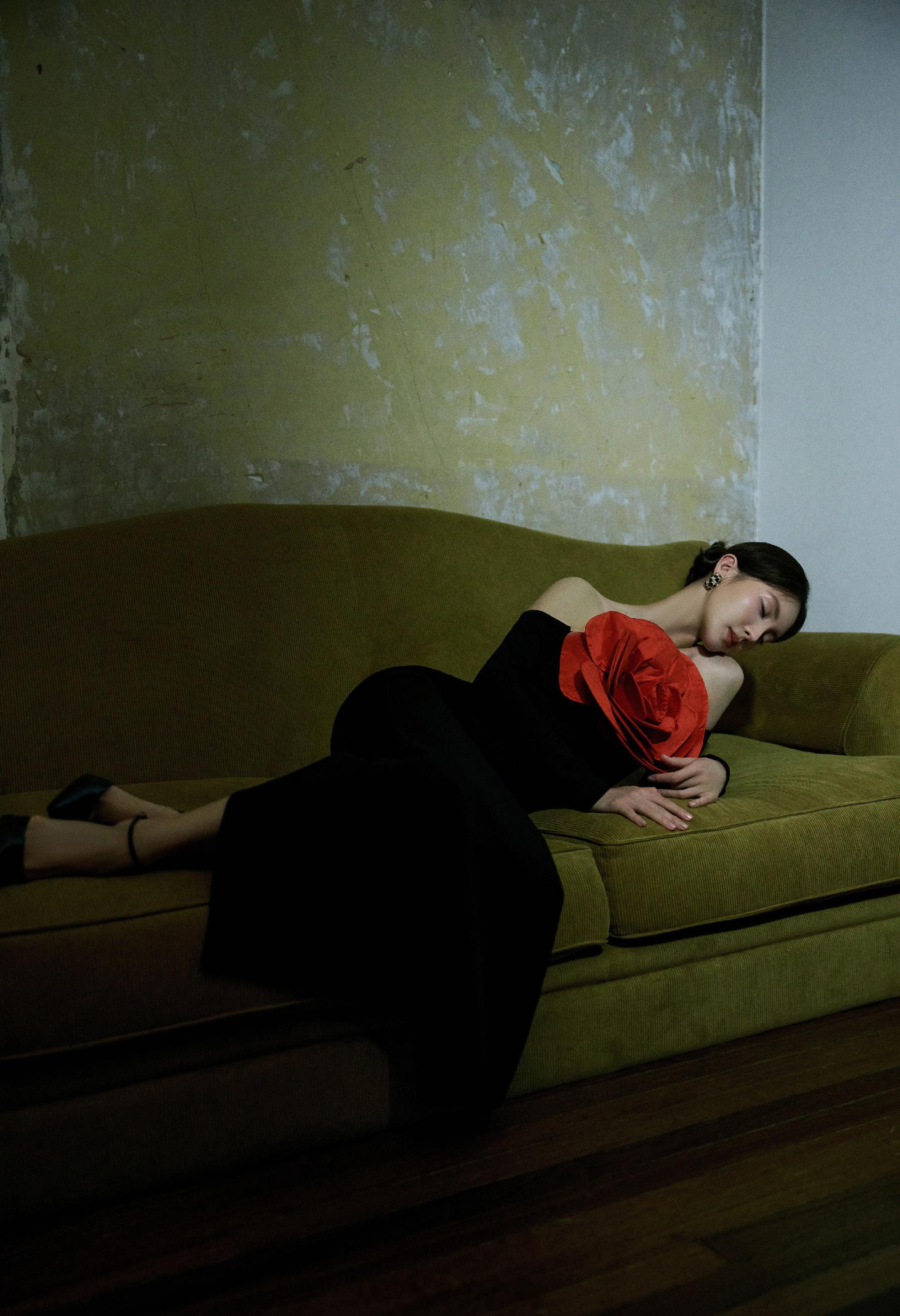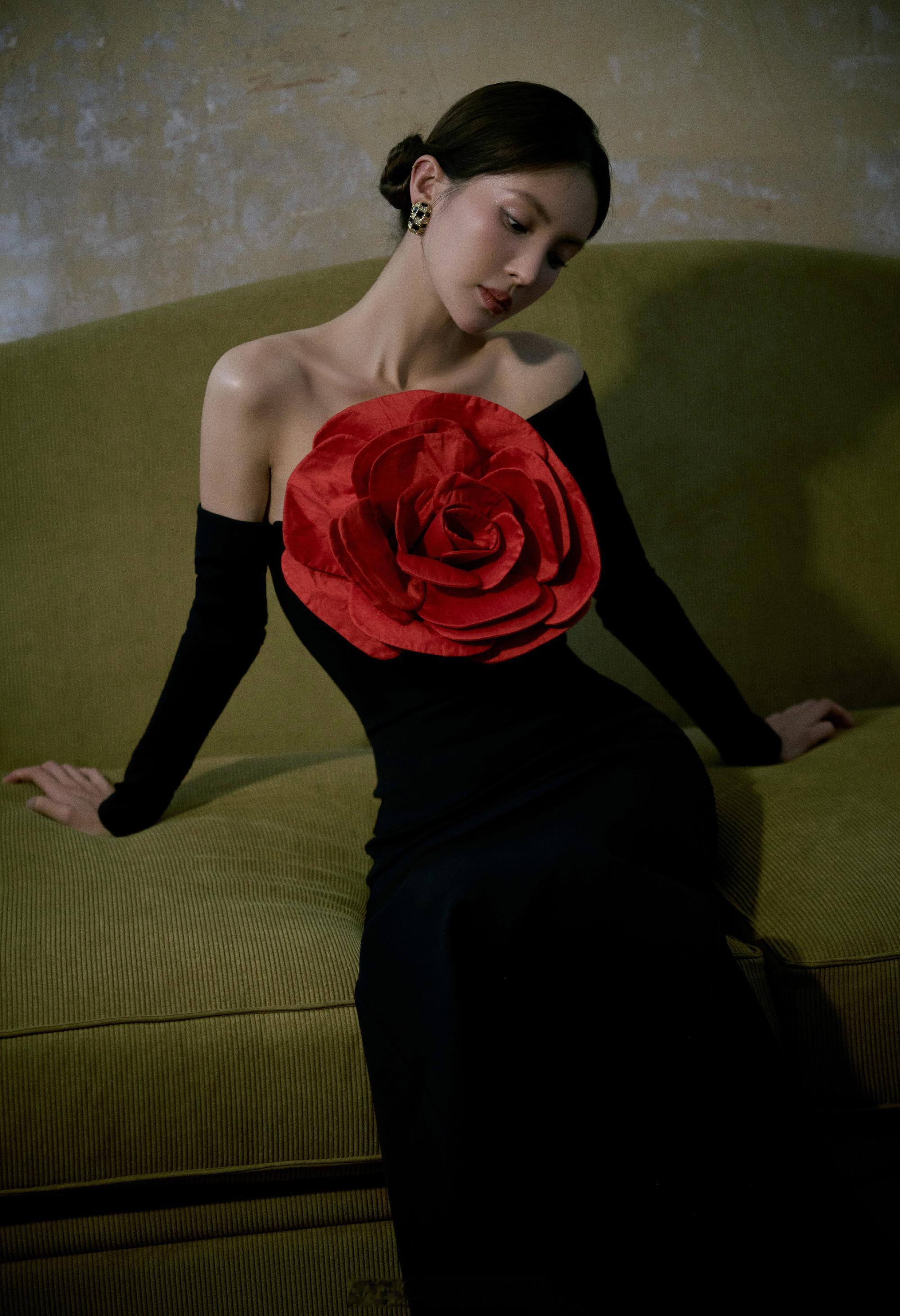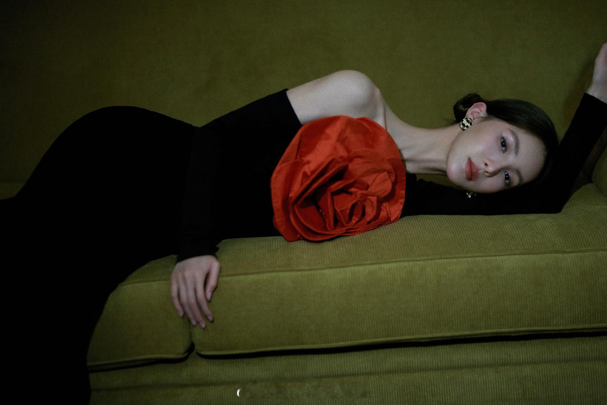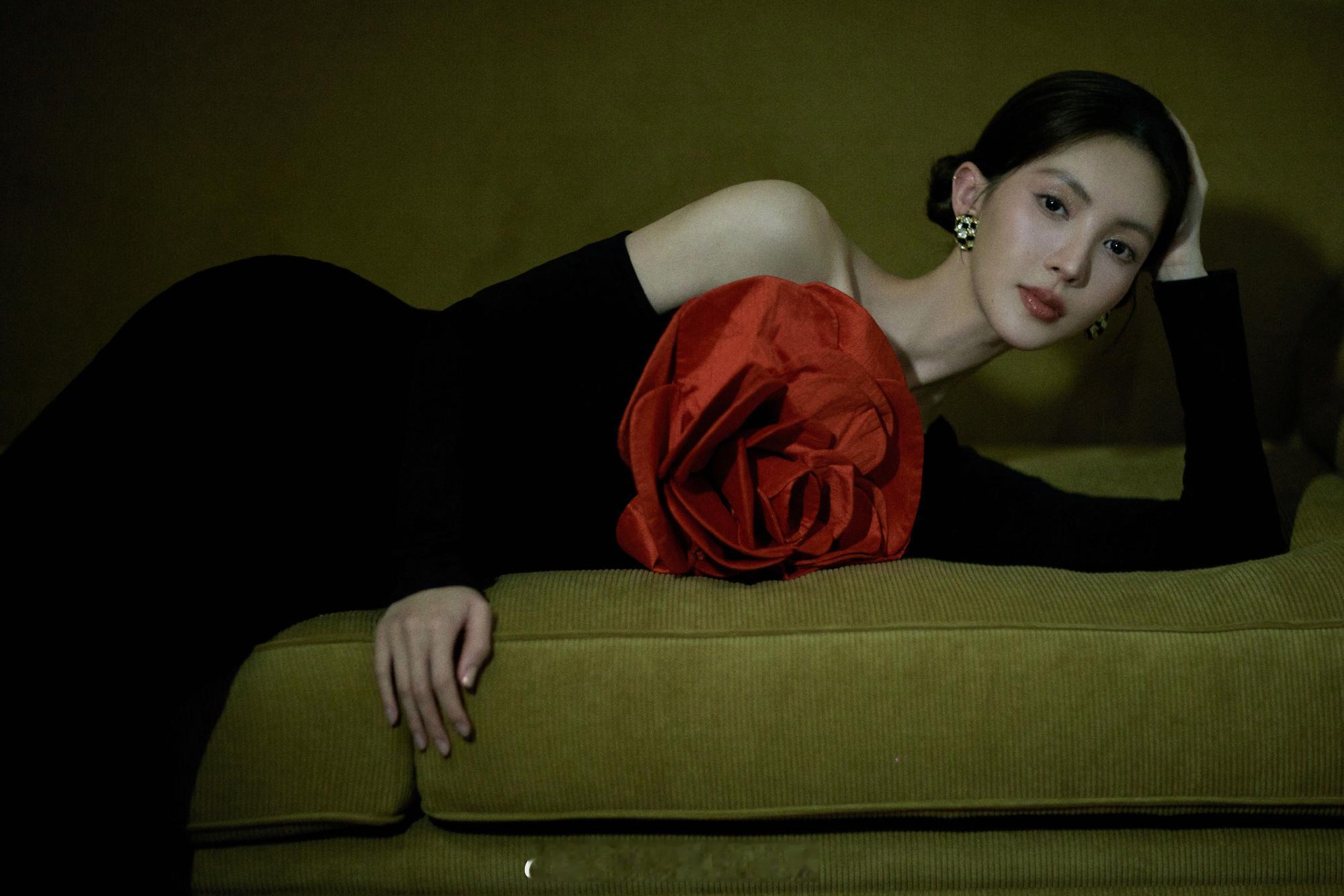 金晨黑色长裙胸前大红花朵