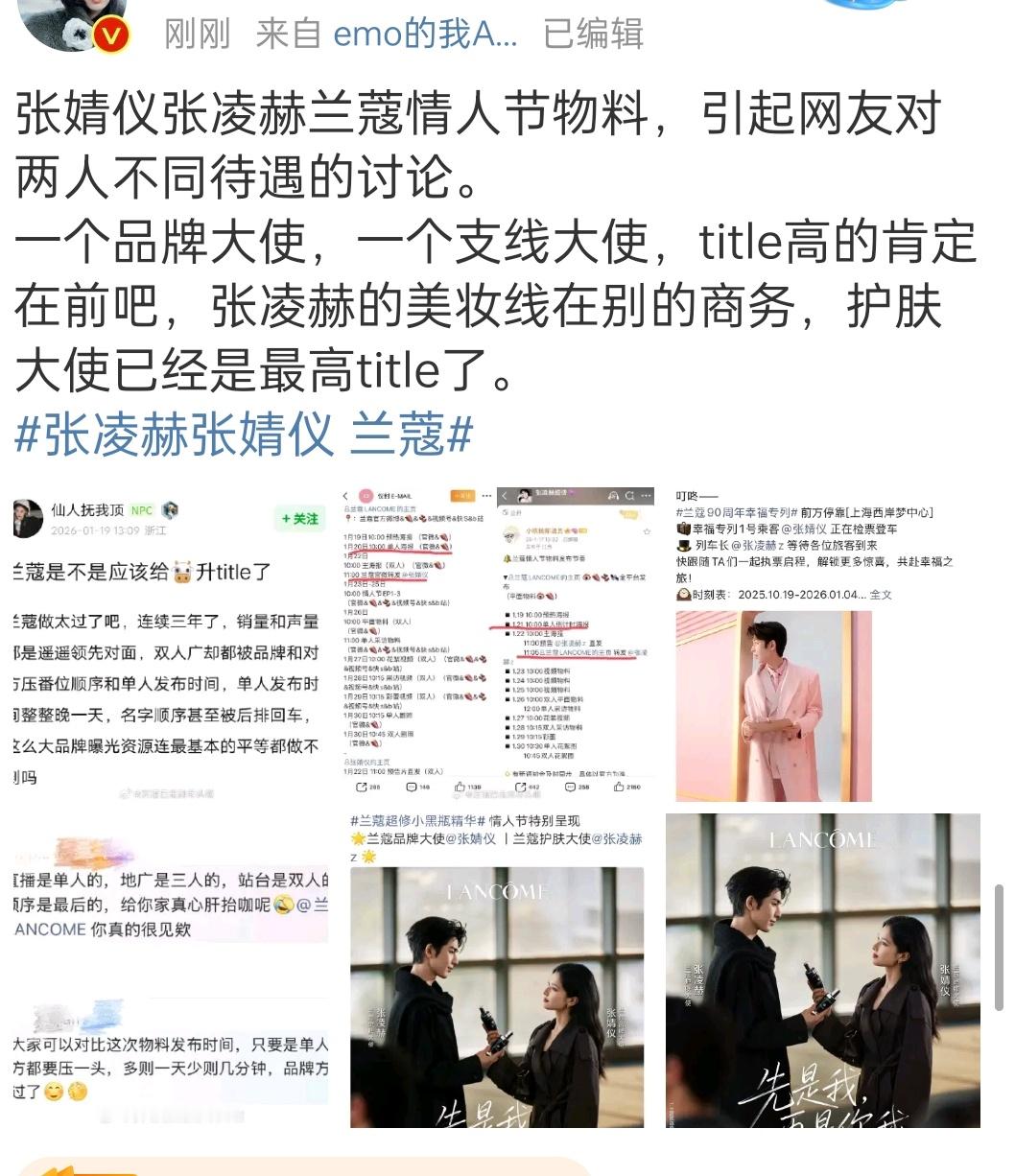 牛牛粉丝这么一闹,才发现牛牛兰蔻的title和待遇都不如张婧仪张婧仪是品牌大使,张凌赫是护肤大使。双人物料也一直是张婧仪名字在前
