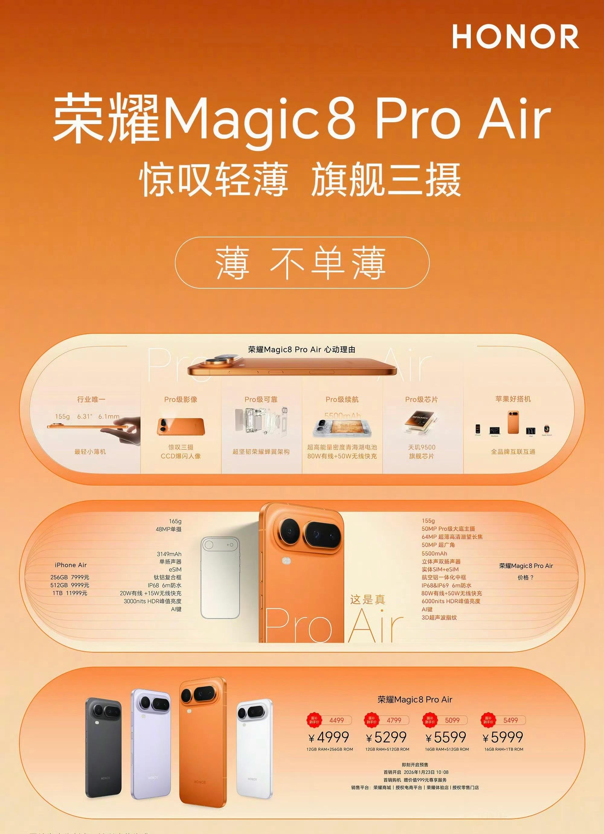 荣耀Magic8 Pro Air 起售价4999元。这价大家觉得怎么样?🤔