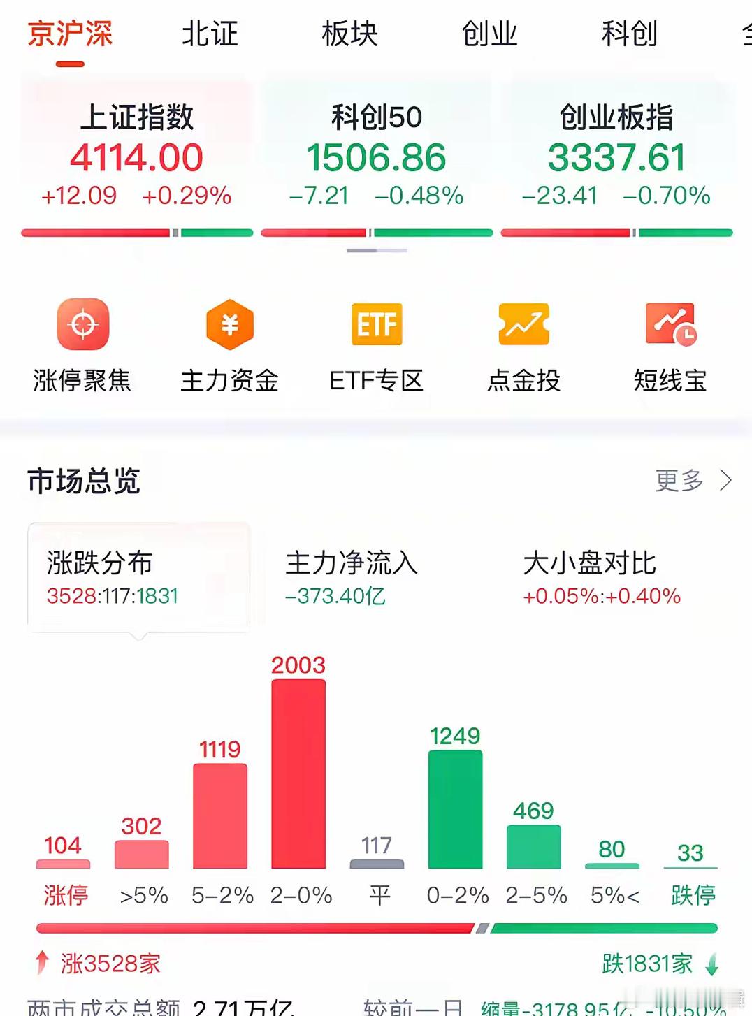 A股缩量反弹成交量2.7万亿元,周二选择方向投资者不用悲观:1月19日收评,A股今天缩量反弹,超3500家上涨,但实际上赚钱效应并不好,只是量化基金还在玩的小盘股中证2000还在上涨,明天选择方向。成交量只有2.7万亿元了,大概率还会继续震荡探底。我预计A股会继续缩量到2.2万亿元-2.5万亿元成交量才会触底反弹。本周我的预判没有没变化,盘面先抑后扬,我看盘一般不是看指数涨跌,那个小学生都会看,而且沪指已经失真,要看赚钱效应。今天热门板块方面,AI应用继续下跌,CPO、商业航天都在震荡下跌,个股严重分化。今天大涨的电力板块,也是最后的诱多,要注意风险了,投资者不要追涨。今天科技股只有机器人板块还在反弹上涨,但也属于高位震荡了,有诱多信号。近期大势上ETF资金净流出,指数和大盘股缺乏上涨动力。题材股方面,有一些游资被查,高位爆炒的缺乏业绩的公司继续注意风险,龙头股抢个短线反弹就走,目前还不具备大幅反攻的基础。而且又到了月底时间,散户把控制风险放在第一位,以低吸为主,尽量不要追大涨,追大涨的个股和板块,大概率都是被套,无论哪一个板块。宁可不做休息别追高。整体看,短期月底时间适合控制好仓位和风险再赚钱,否则A股赚钱不易,亏钱是很容易的。2026年A股不悲观,中长线我依旧看好A股市场,看好CPO、存储芯片等高科技赚钱效应,量化交易策略也继续看好。