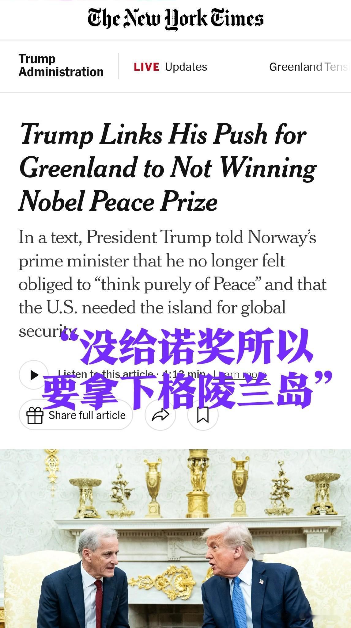 得不到就毁灭? 美国总统特朗普今天致信挪威首相,称他不再有义务单纯考虑和平,而是优先考虑美国利益——因为他没有获得诺贝尔和平奖! 如果他所做过的一切,目的在获得和平奖,那么和平从来就不是他的真正目标。别忘了,他已经轰炸了七个国家,外加在自己院子里搅得一片混乱。 现在他还对全世界说因为挪威没给自己诺贝尔奖,所以他要入侵格陵兰岛[我想静静]