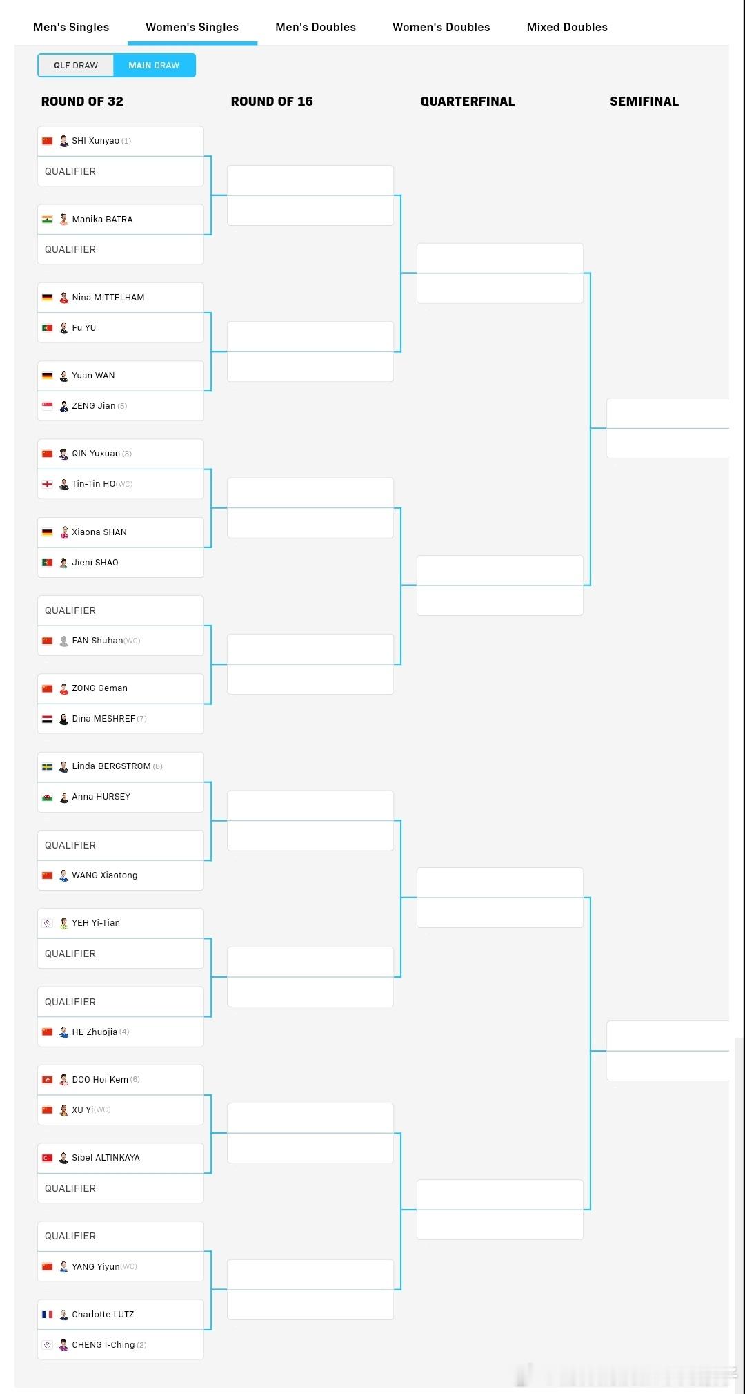 2026WTT马斯喀特常规挑战赛女单正赛签表:1/8区:石洵瑶🇨🇳VSQ、巴特拉🇮🇳VSQ2/8区:付玉🇵🇹VS尼娜🇩🇪、万远🇩🇪VS曾尖🇸🇬3/8区:覃予萱🇨🇳VS何天天🏴󠁧󠁢󠁥󠁮󠁧󠁿、单晓娜🇩🇪VS邵杰妮🇵🇹4/8区:QVS范姝涵🇨🇳、纵歌曼🇨🇳VS梅谢芙🇪🇬5/8区:伯格斯特隆🇸🇪VS赫尔希🏴󠁧󠁢󠁷󠁬󠁳󠁿、QVS王晓彤🇨🇳6/8区:叶伊恬(中国台北)VSQ、QVS何卓佳🇨🇳7/8区:杜凯琹🇭🇰VS徐奕🇨🇳、阿尔廷卡亚🇹🇷VSQ8/8区:QVS杨屹韵🇨🇳、夏洛特卢茨🇫🇷VS郑怡静(中国台北)